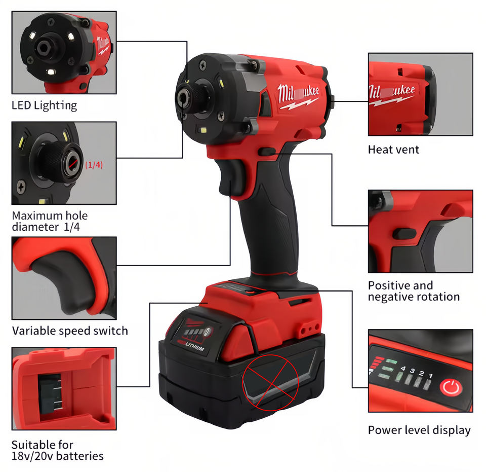 Cacciavite Elettrico Serie Rossa con Rinforzo in Legno, Luce da Lavoro 2600IPM, Alta Prestazione, Senza Fili, Durevole, 18V