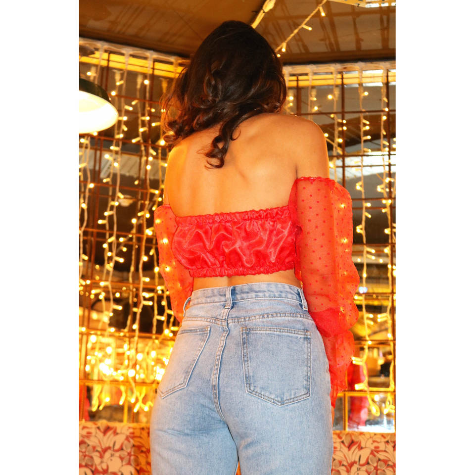 Sbuffo rosso trasparente sulla spalla increspato tubo delle tette