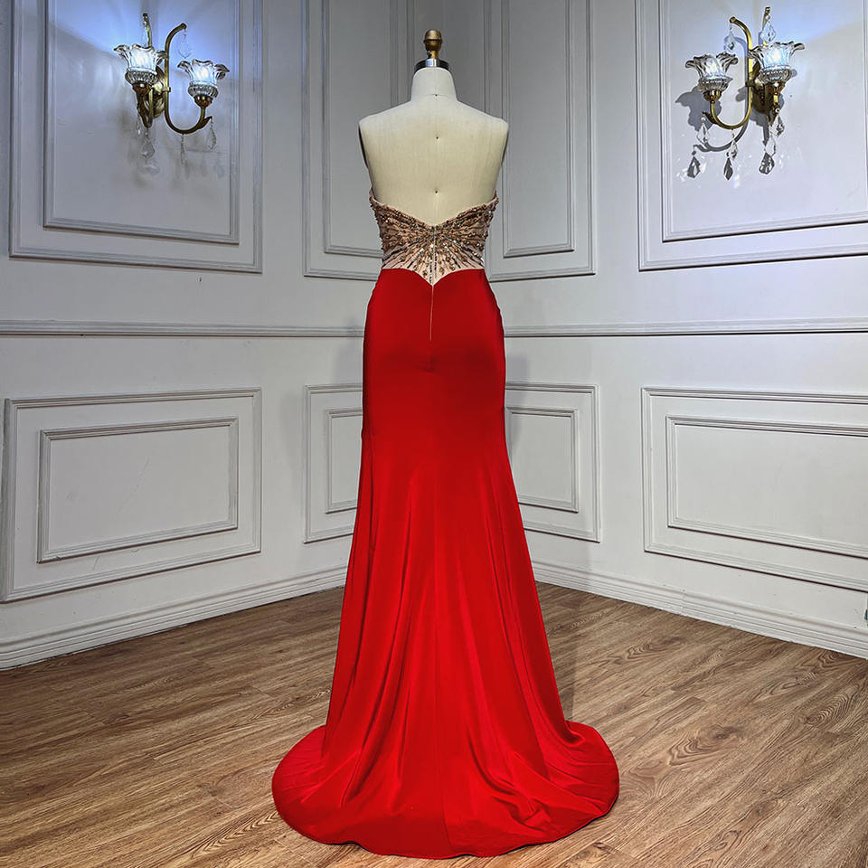 Abito da Sera Rosso Senza Spalline a Sirena con Perline Serene Hill LA71731, Vestito Sexy con Spacco per Passerella