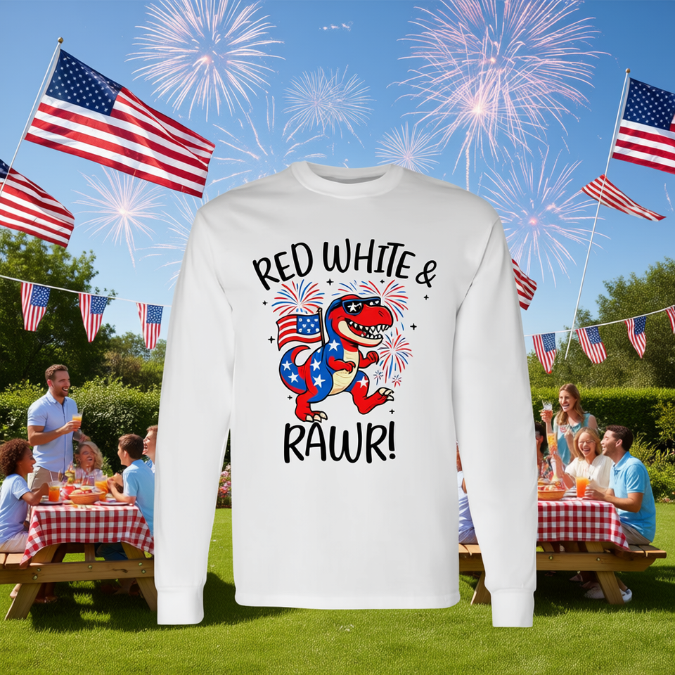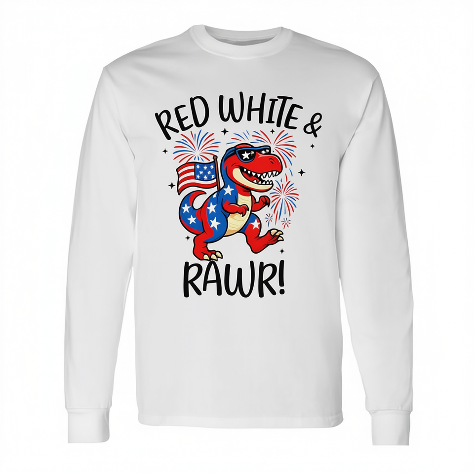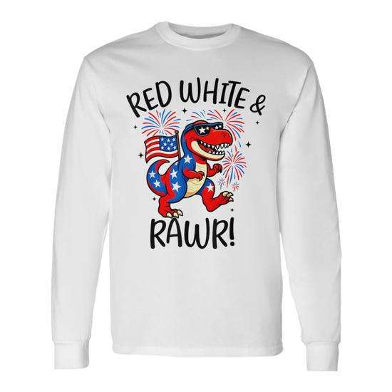Maglietta a maniche lunghe Red White And Rawr Dino T Rex 4th July Usa Patriotic Design