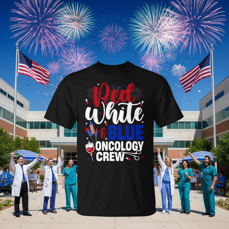 Maglietta da infermiera del 4 luglio della squadra di oncologia rosso bianco blu