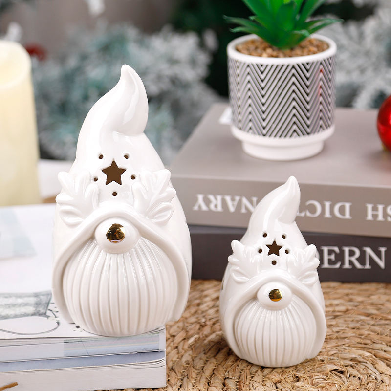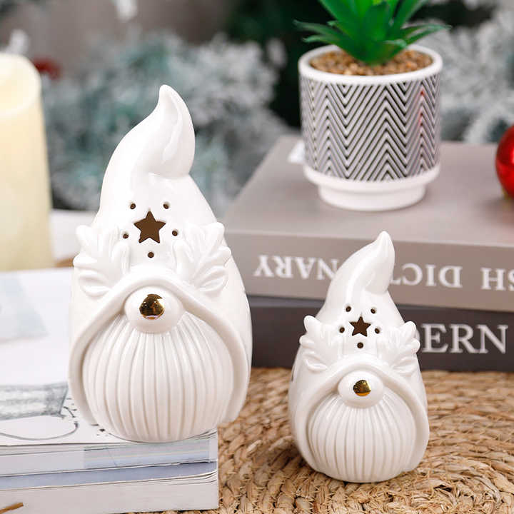 Redeco Cute Ceramic Elf Ornaments White Ceramic Gnome Ornament With Led Lights for Gifts Home Decoration