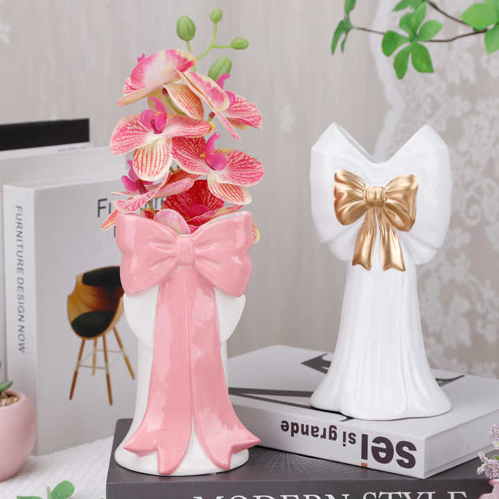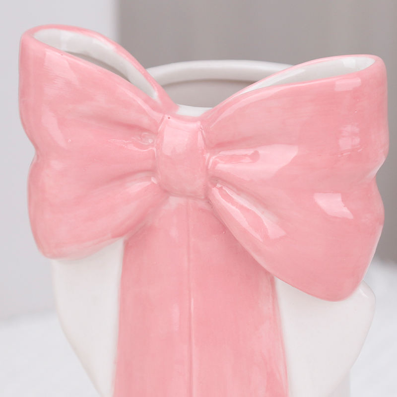 Redeco Elegant White Ceramic Vase With Pink Golden Bowknot Design Home Decor Ceramic Vase for Living Room Bedroom Centerpiece