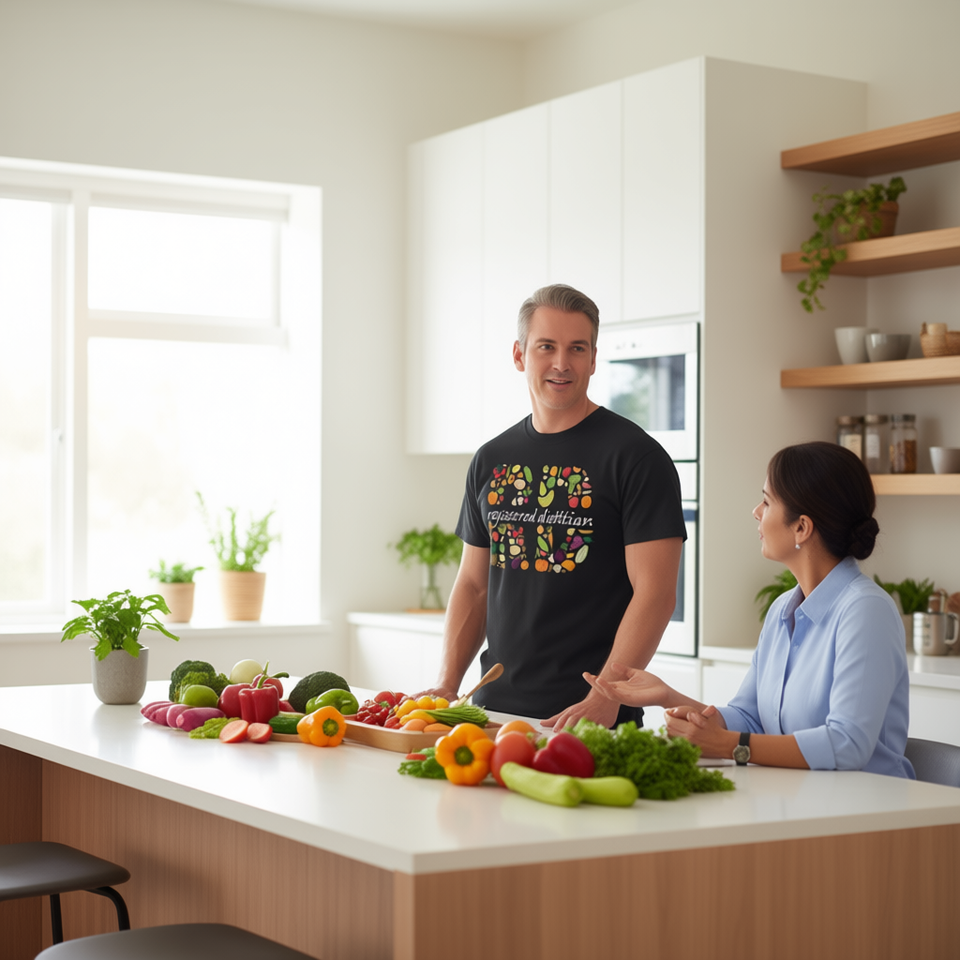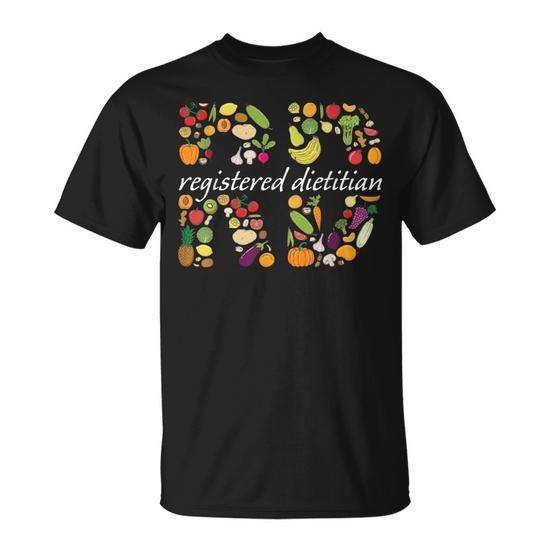 T-shirt Dietologo Registrato con Design Alimentare, Girocollo Nero, Unisex Adulto, Manica Corta, Stampa Digitale, Promozionale