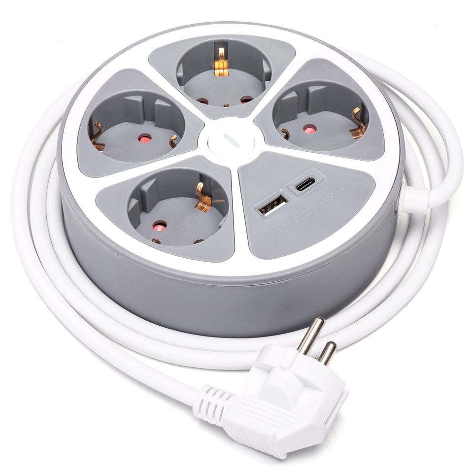 Regleta - regleta redonda de 4 vas, 1,5 m, con interruptor, puertos USB y tipo C, cable 3G1,0 mm, ideal para mltiples