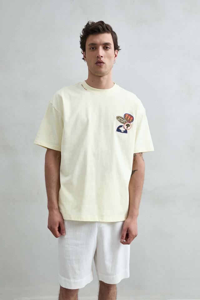 Regular Fit Light Beige 100% Cotton T-Shirt Floral Print Short Sleeve Anti-Pilling Normcore/Minimalist Style 240 Grams Watermark