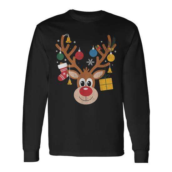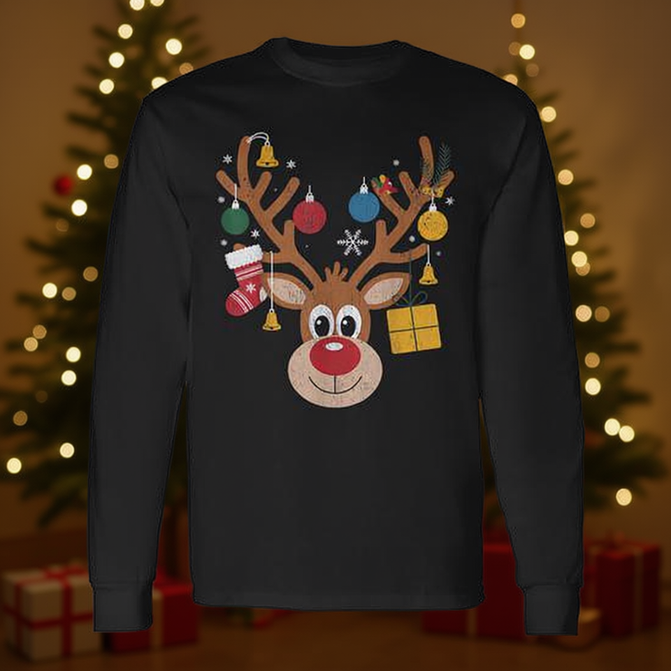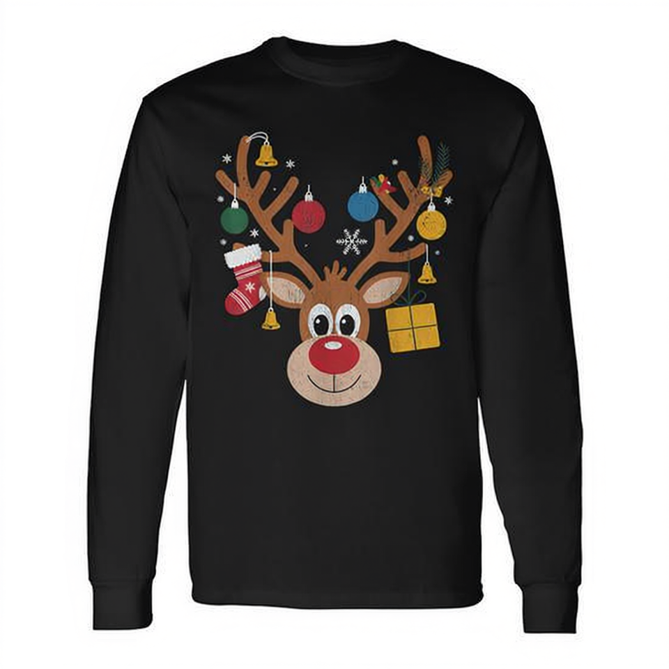 Reindeer Face Christmas Long Sleeve T-Shirt Adult Unisex Crew Neck Digital Printing Holiday Design