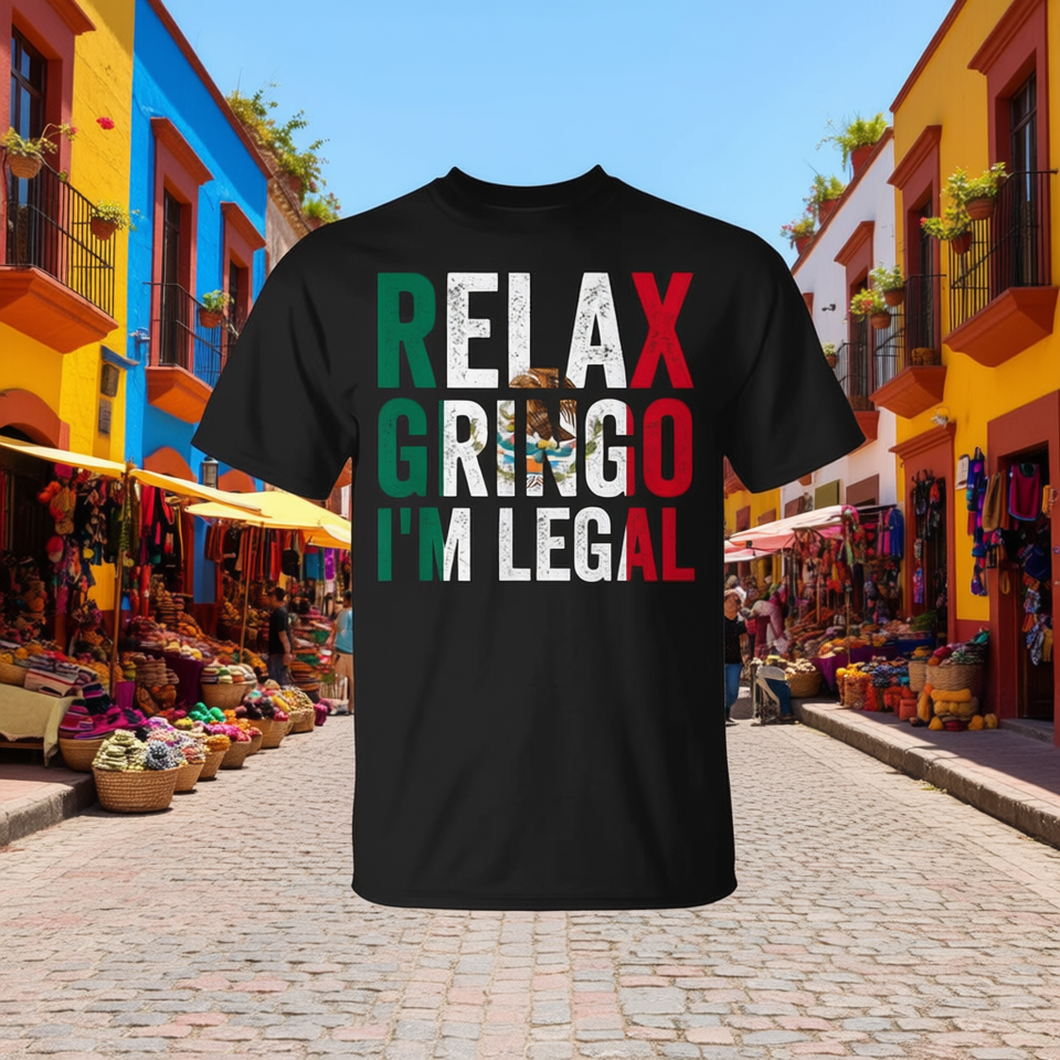 T-Shirt 'Relax Gringo I'm Legal Mexico' con Design per Immigranti Messicani, Collo Tondo, Manica Corta, Unisex, Stampa Serigrafica, Made in China