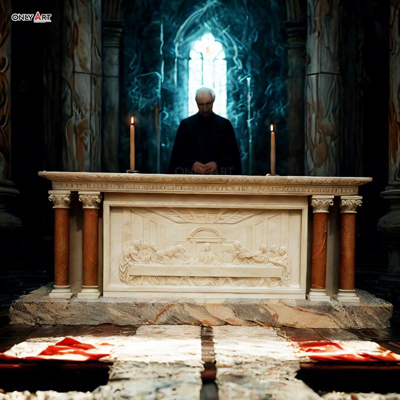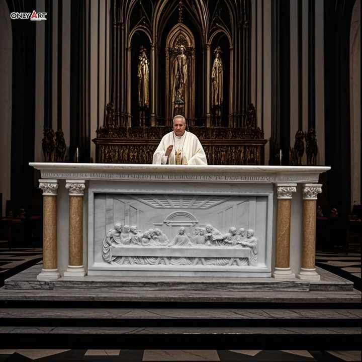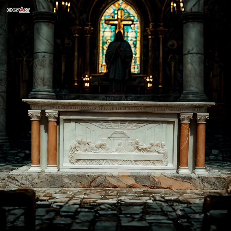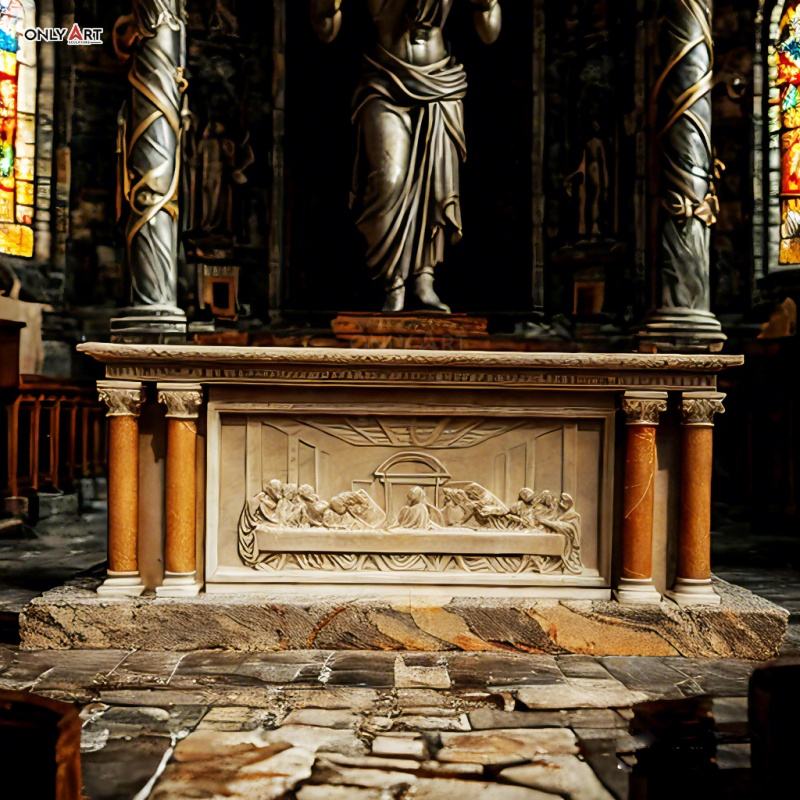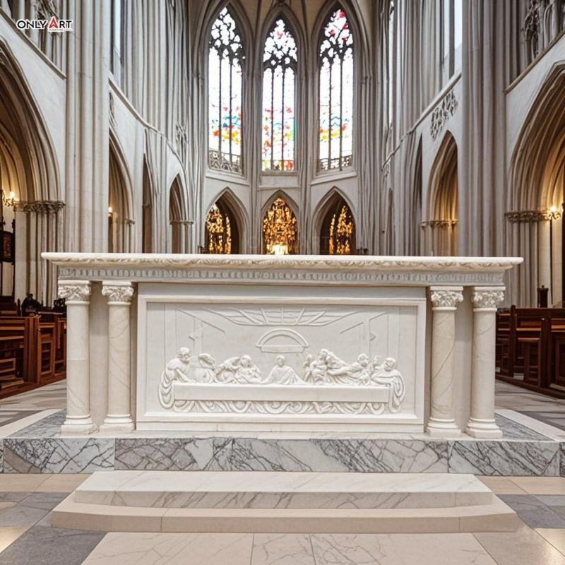 Decorazione della chiesa religiosa pietra naturale intagliata tavolo dell'altare grande marmo bianco chiesa altare tavolo ultima cena rilievo scultura