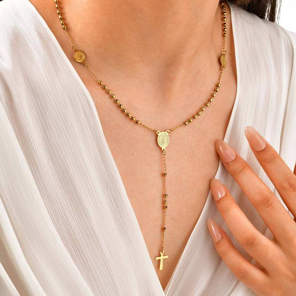 Collana Rosario Cattolico con Ciondolo a Croce a Forma di Y della Vergine Maria di Guadalupe e Perle Imitazione