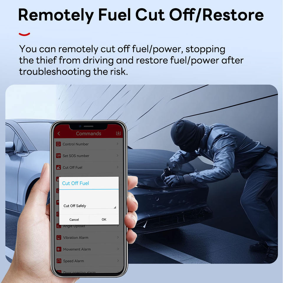 Telecomando, Tracciamento in tempo reale, chiamata SOS, Blocco/sblocco porta, rilevamento del jammer, impermeabile IP67, allarme tramite cicalino, posizione tramite cicalino, riproduzione del percorso storico, allarme porta aperta, Allarme di velocità eccessiva, allarme di vibrazione, recinzione geografica, allarme di movimentoFunzione