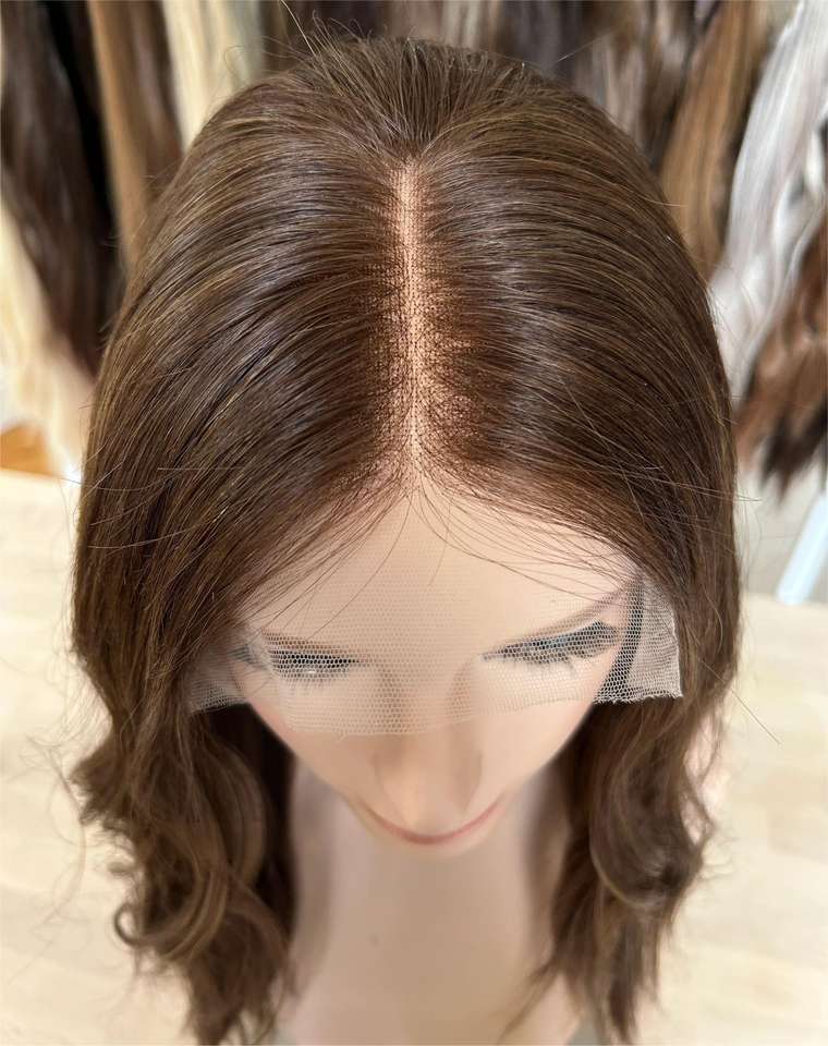 Remy European Hair Single Knot Hand Tied Lace Top Jewish Wig Brunette With Warm Blonde Highlight Color Lace Front Wig for Women