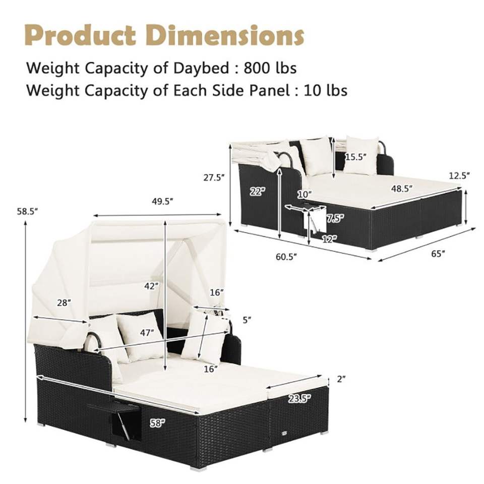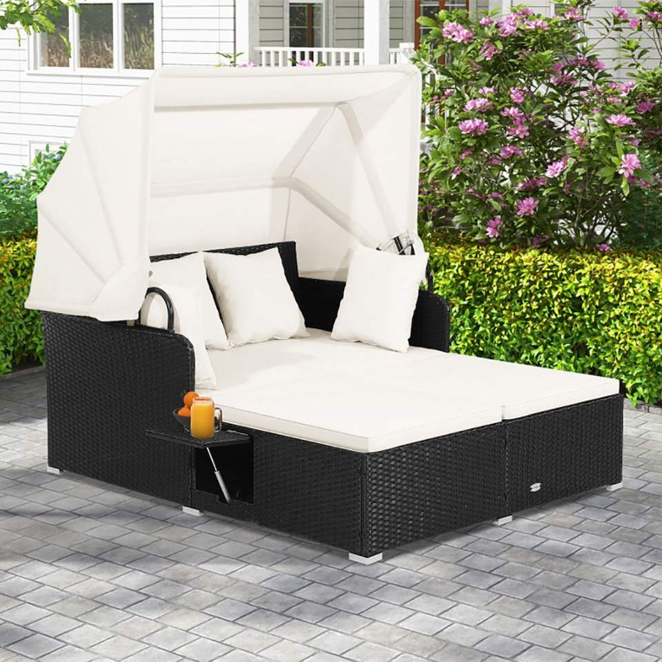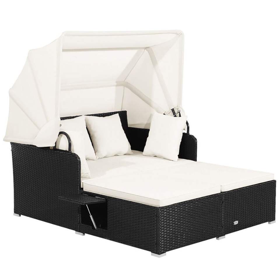 Lettino con Tettuccio Retrattile e Tavolini Laterali, Set di Mobili in Rattan per Esterni, Ideale per Gazebo e Pergole