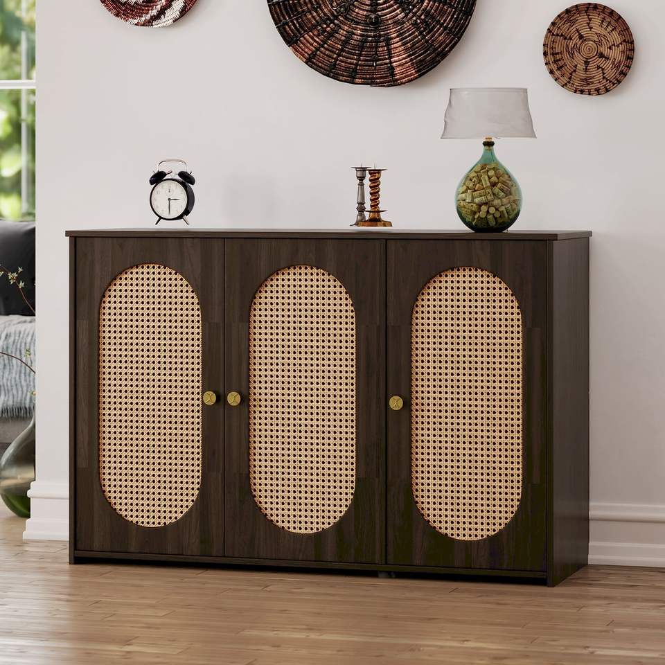 Credenza retrò a 3 ante con ampio spazio contenitivo, ante in rattan sintetico, maniglie in metallo, mobile d'accento per soggiorno