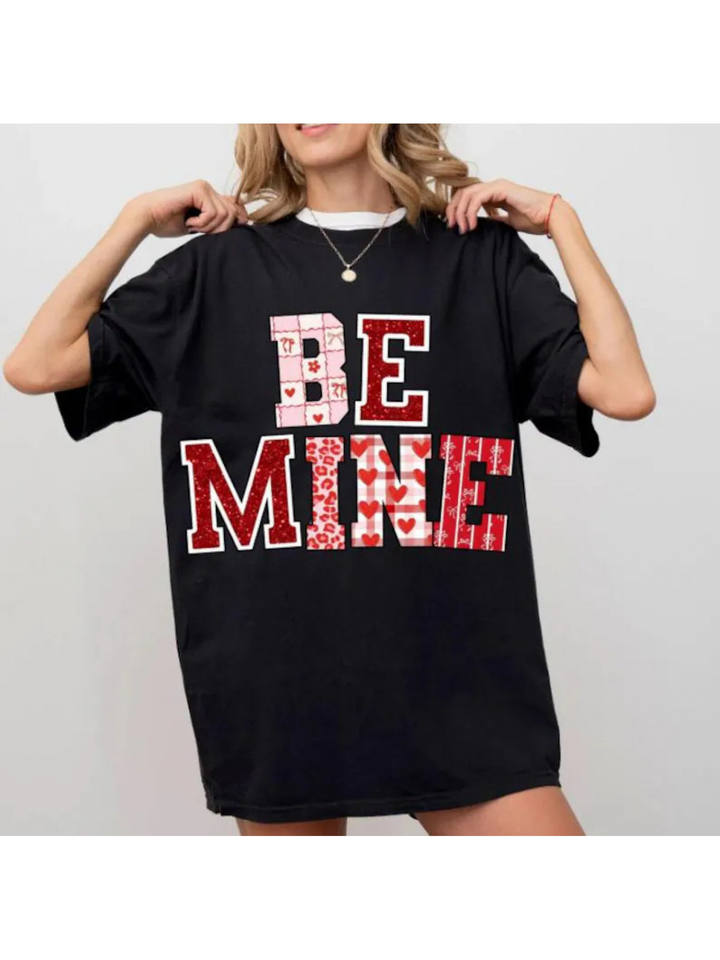 Retro Be Mine Valentine Glitter T-Shirt Women Short Sleeve Crew Neck Heart Pattern 100% Cotton Jersey Regular Fit Spring Summer