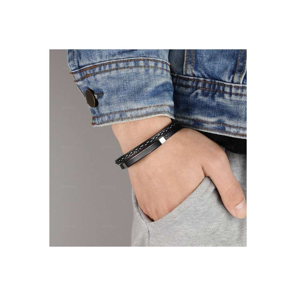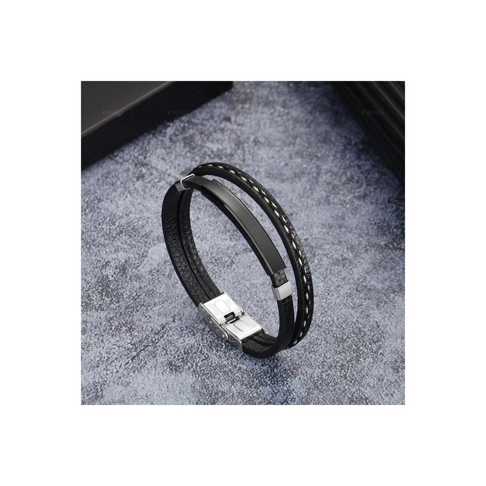 Retro Black Leather & Black Color Steel Plate/Mechanism Men's Bracelet with Personalized Letter/Name Written