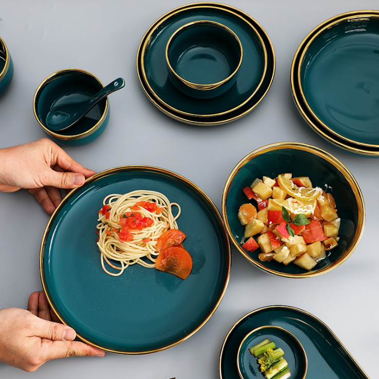 Set da Pranzo in Ceramica Verde Scuro Retrò con Bordo Dorato, Stoviglie in Porcellana con Finiture Dorate