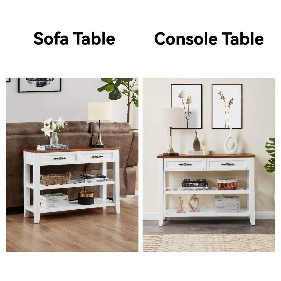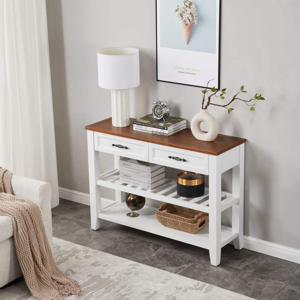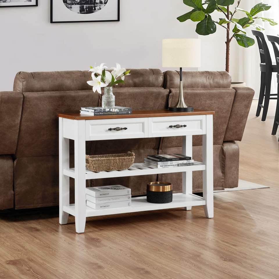 Consolle in Legno Massello di Pino dal Design Retrò con Ripiani Aperti e Gambe per Arredamento Soggiorno