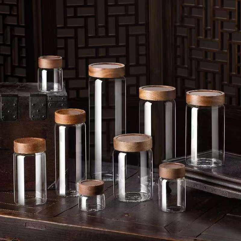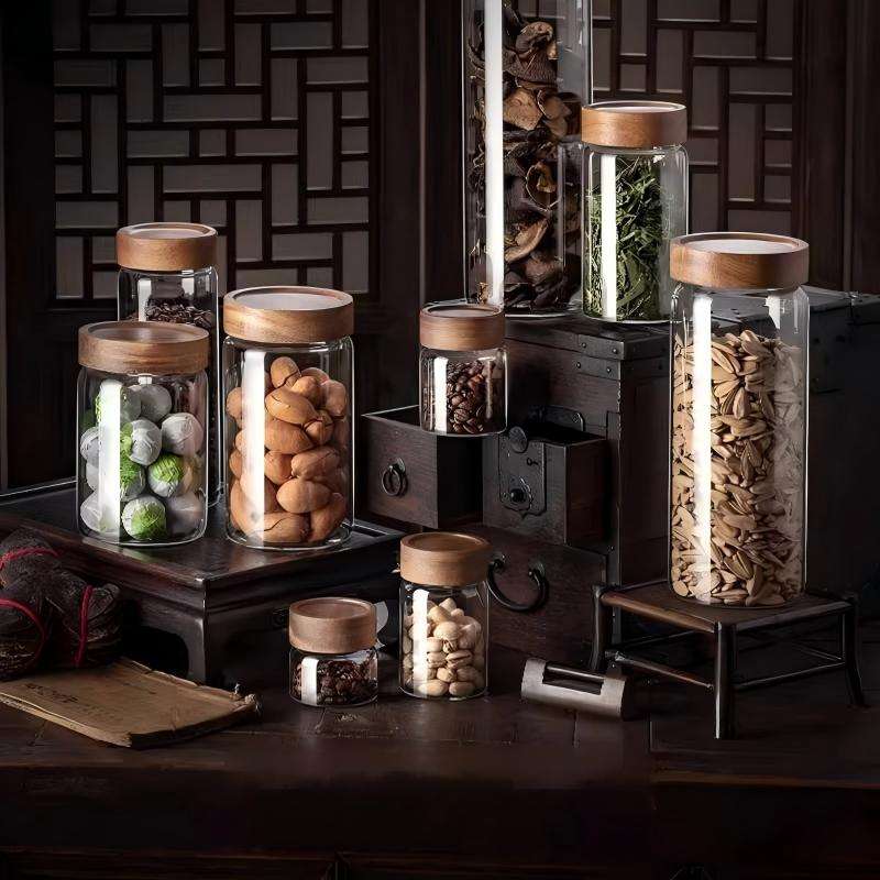 Barattolo di Vetro Ecologico Retrò con Coperchio in Legno Capacità 401-500ml Resistente alle Perdite Multifunzione per Conservazione Alimenti in Cucina