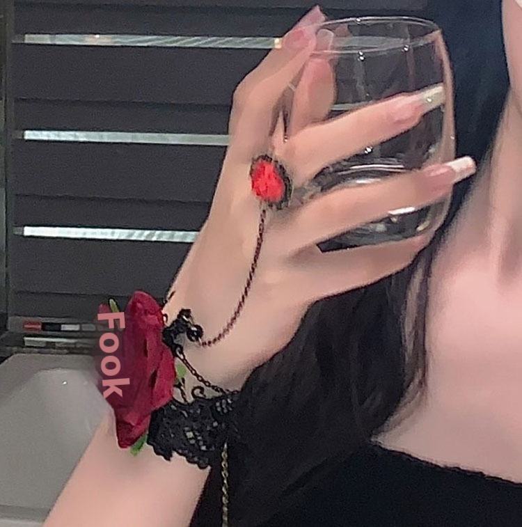 Bracciale in lega stile retro gotico punk con pizzo e fiore borgogna, anello con rosa rossa, polsiera 168+9 cm, set 6 pezzi