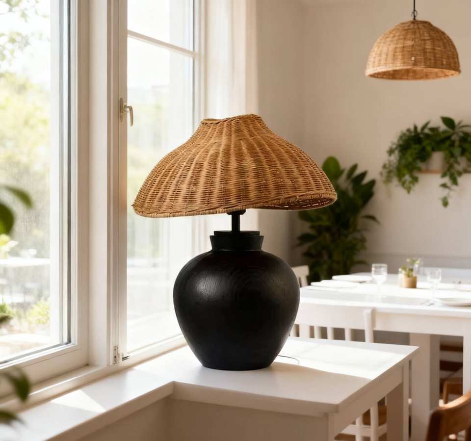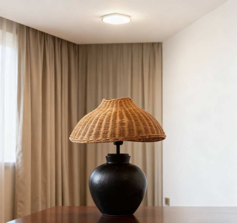 Lampada da Tavolo Retrò in Rattan, Vaso in Ceramica Carbonizzata in Legno Massello, Decorazione Antica per Hotel, Ristorante, Soggiorno, Camera da Letto, Comodino