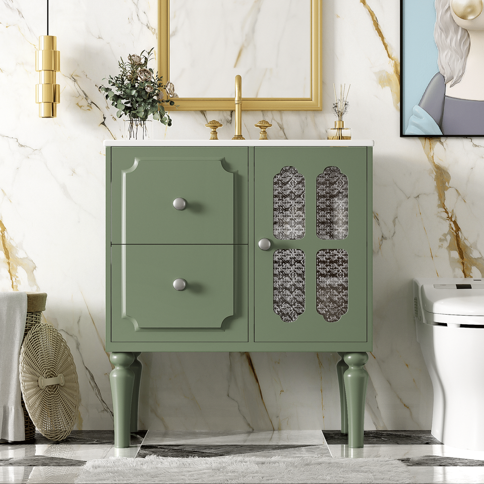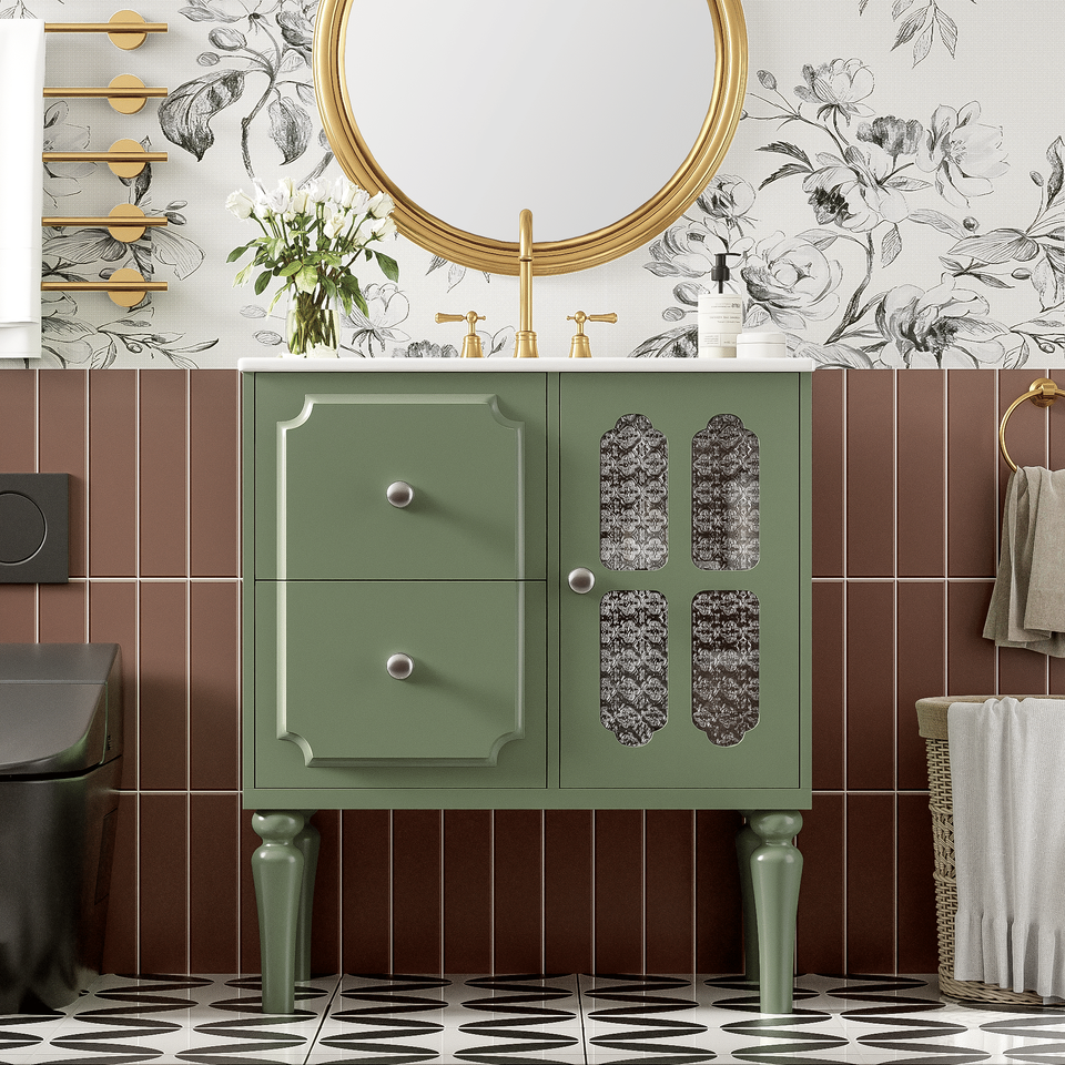 Mobile Bagno Singolo da 30 Pollici Stile Retrò con 2 Cassetti, Lavabo in Resina e Struttura in Legno Massello - Combinazione Mobile Bagno con Spazio Contenitivo