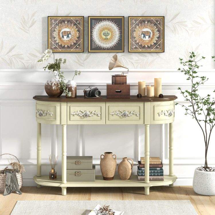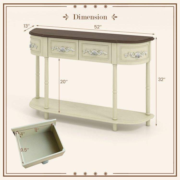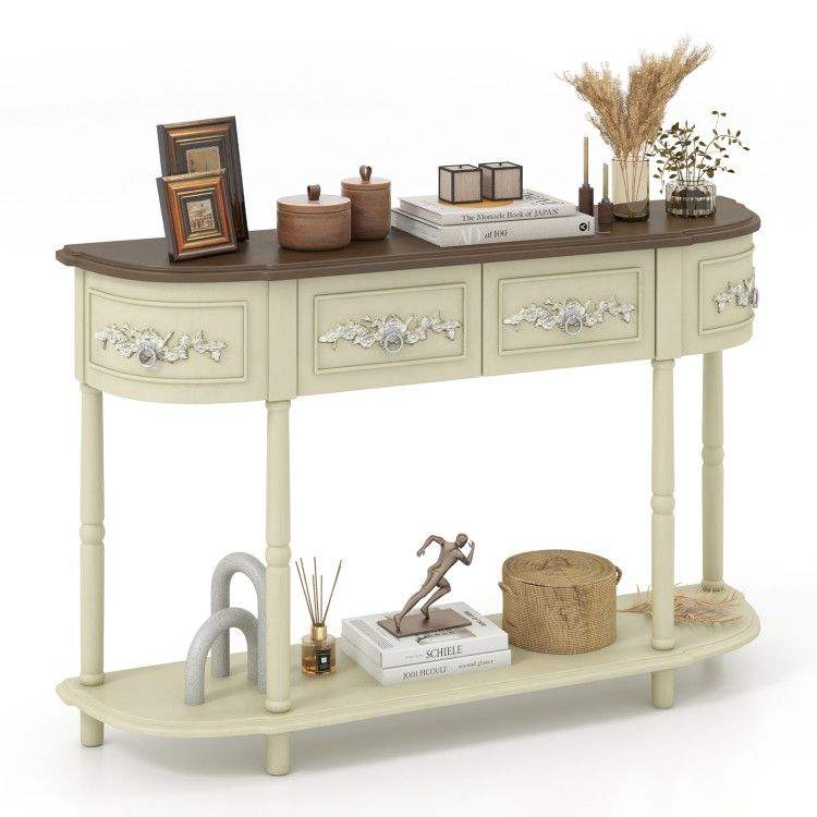 Tavolo Console Curvo in Stile Retrò con Gambe in Legno Massello e Cassetti