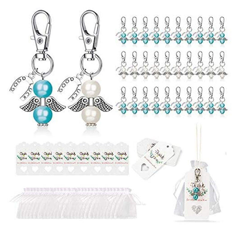Bomboniere con Portachiavi a Forma di Angelo, Etichette di Ringraziamento e Sacchetti in Organza Bianca per Baby Shower, Matrimoni e Feste di Compleanno