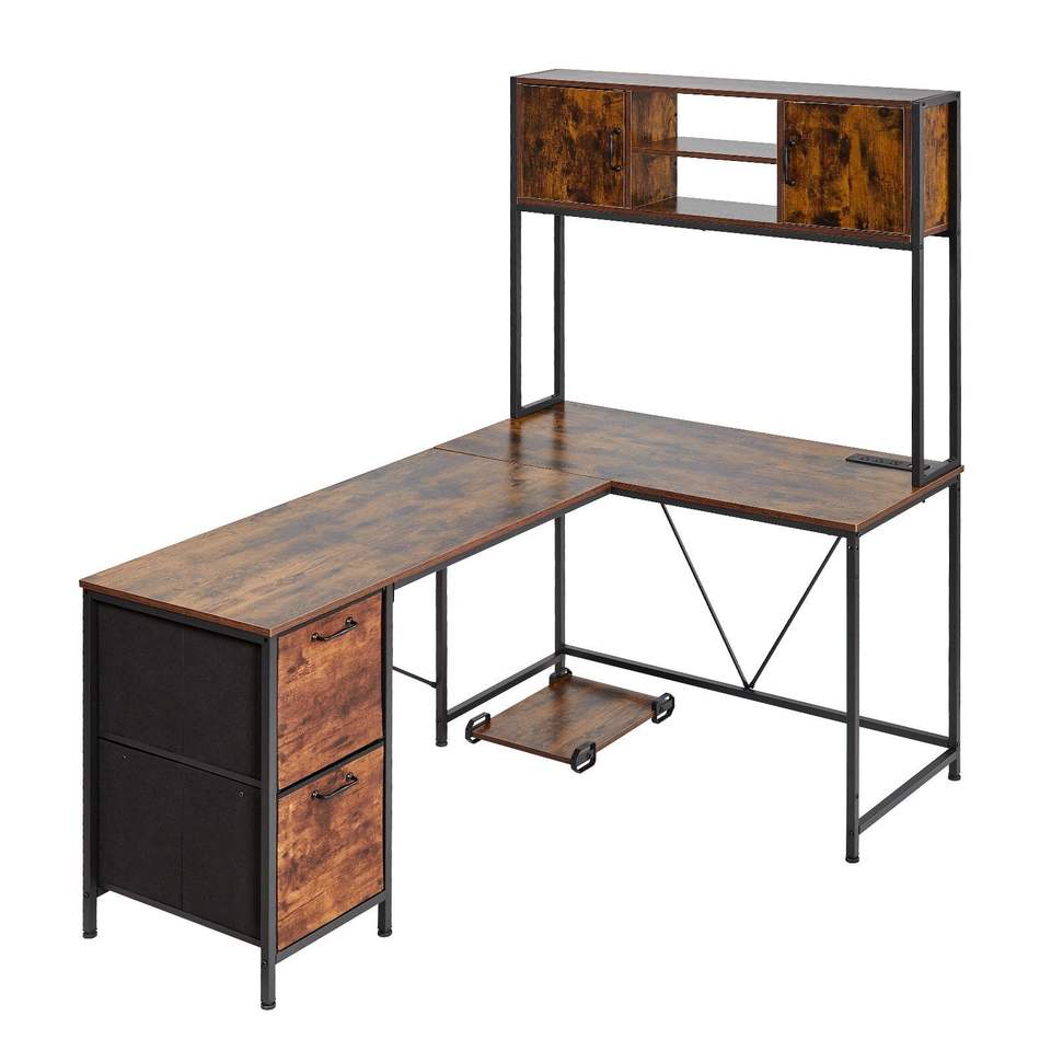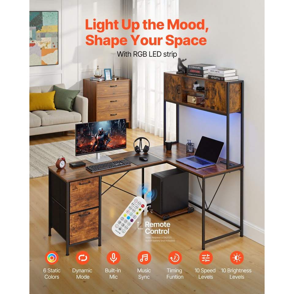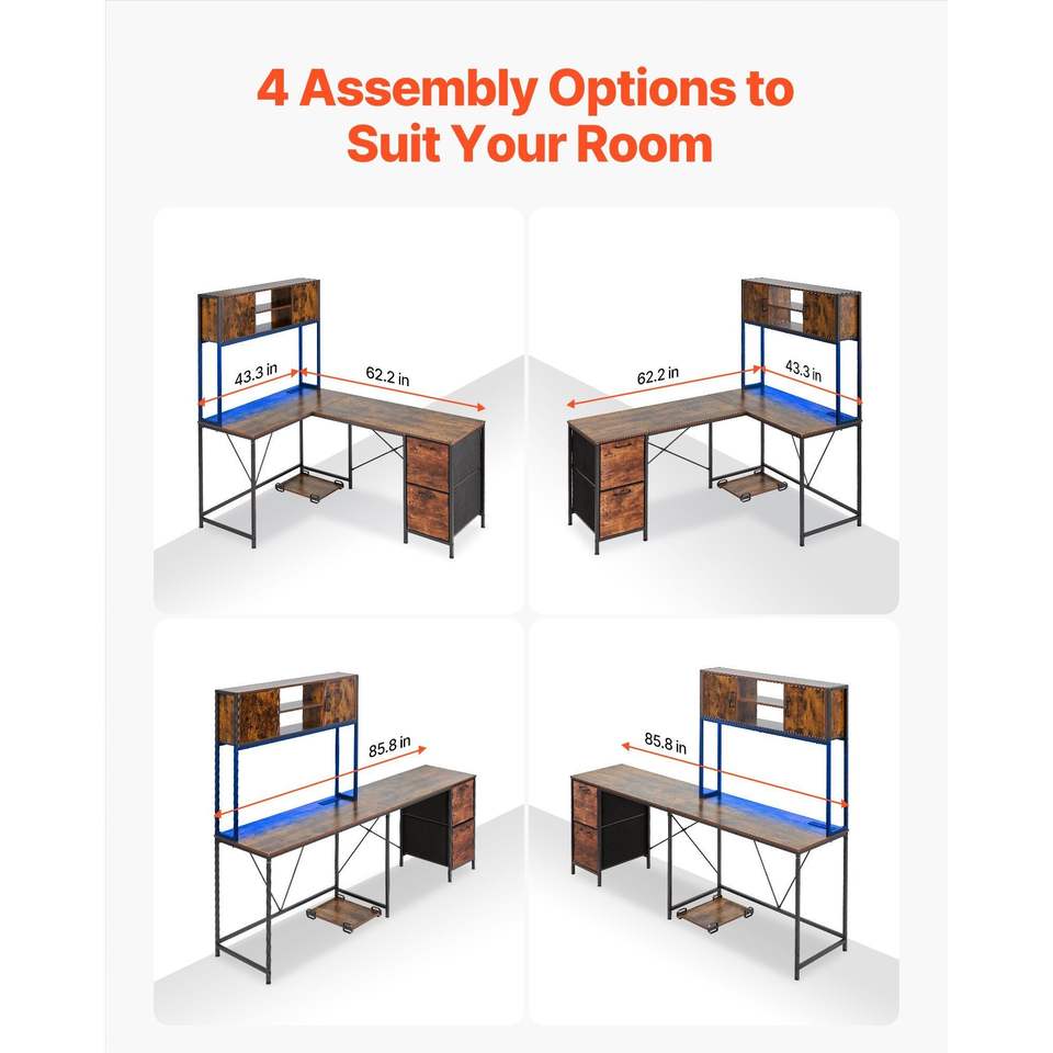 Scrivania da Gaming a L Reversibile da 62,2 Pollici con Luci LED, Supporto CPU e Prese di Corrente, Supporto per Computer Mobile con Spazio di Archiviazione