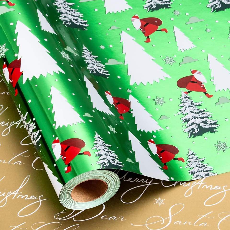 Rotolo di Carta da Regalo Natalizia Verde Reversibile con Lucentezza Metallica, Babbo Natale, Alberi e Scritte Dorate 'Merry', Confezione Regalo per le Festività