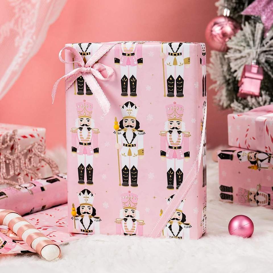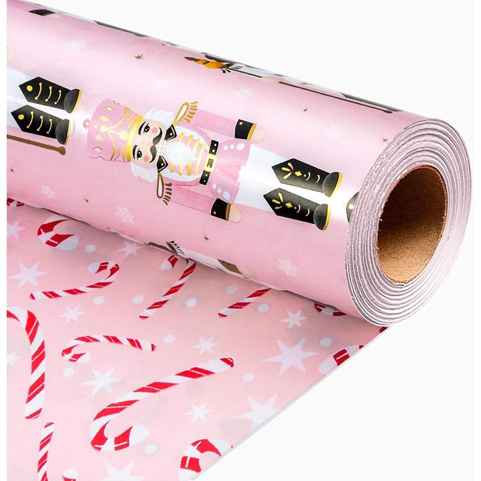 Rotolo di Carta da Regalo Natalizia Rosa Reversibile con Lamina Metallica Lucida, Schiaccianoci e Bastoncini di Zucchero per Confezioni Regalo Festive e Capodanno