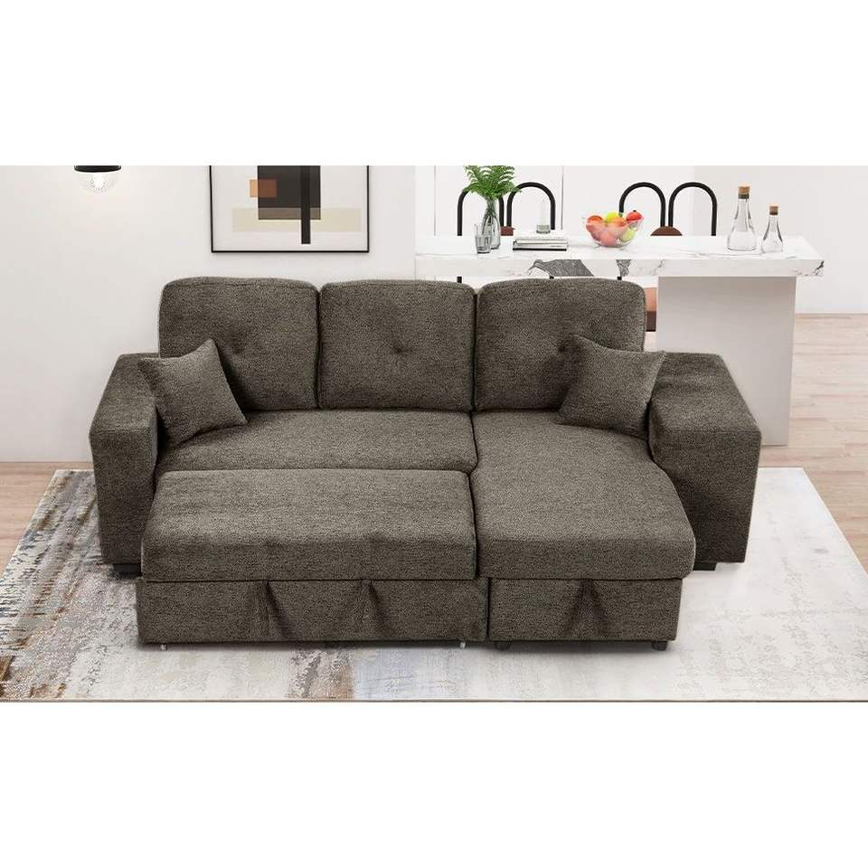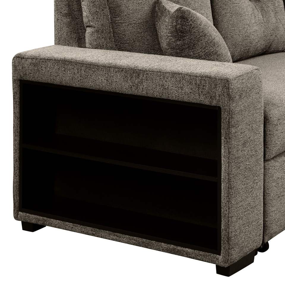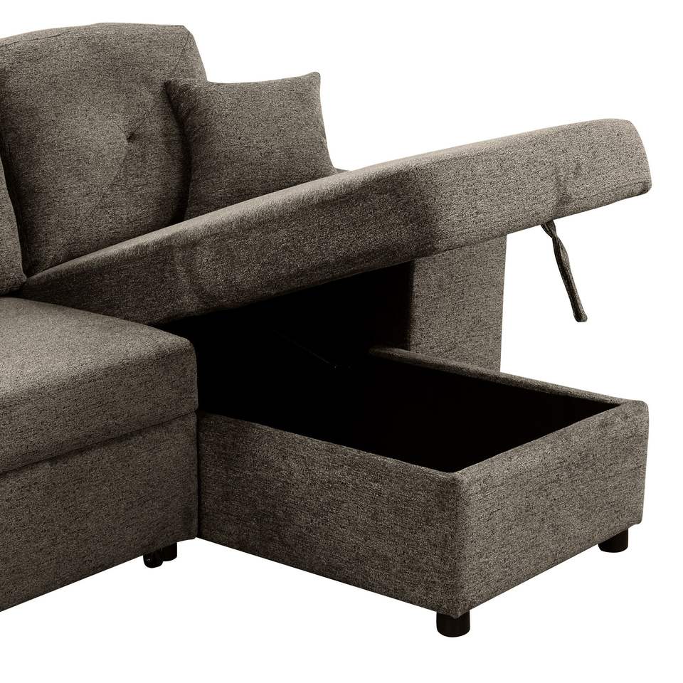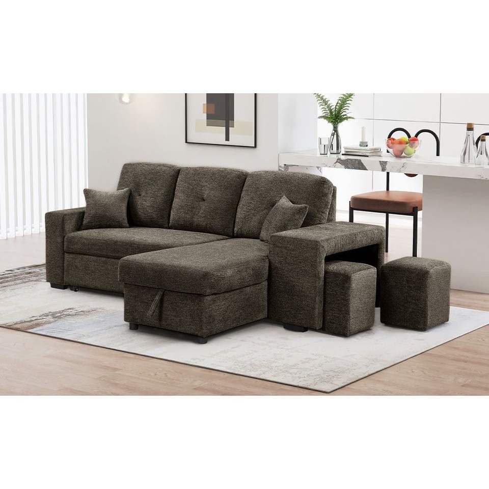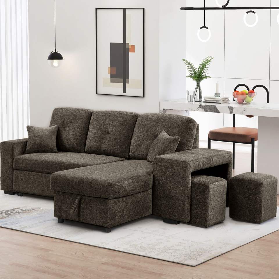 Divano letto angolare a L estraibile reversibile con mensola laterale e 2 sgabelli, divano letto componibile reversibile con contenitore