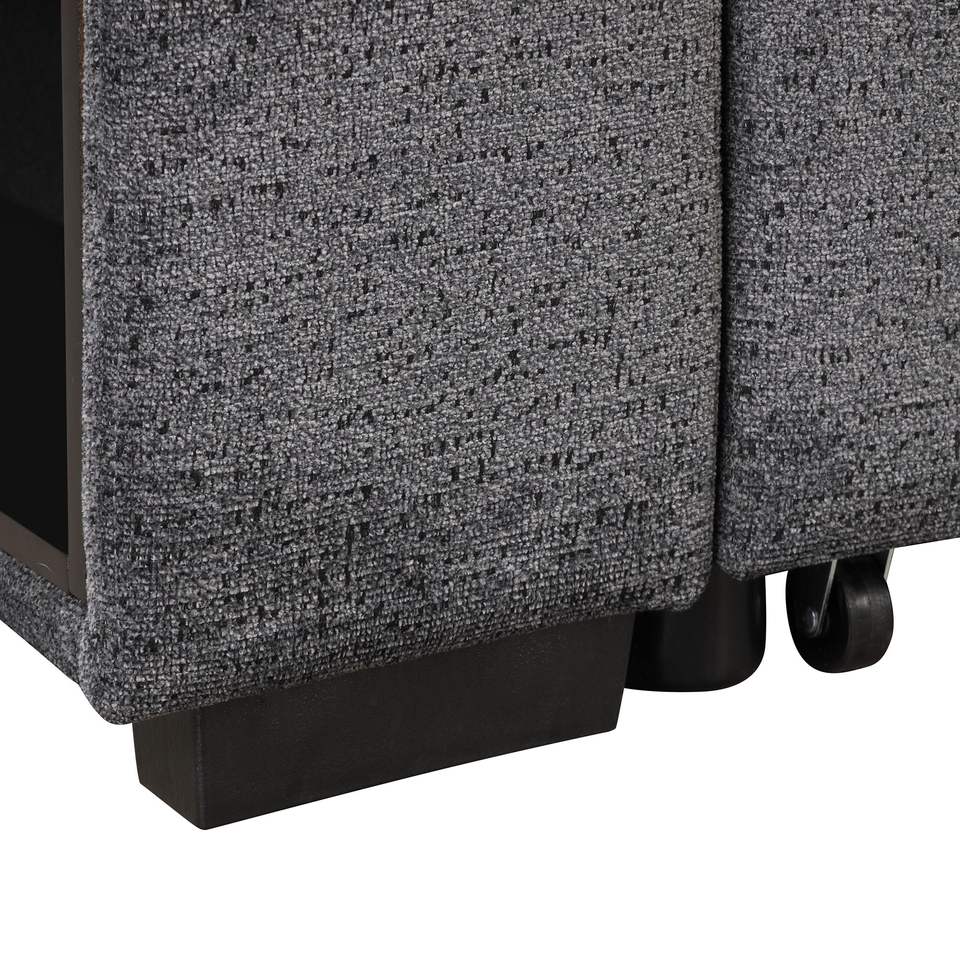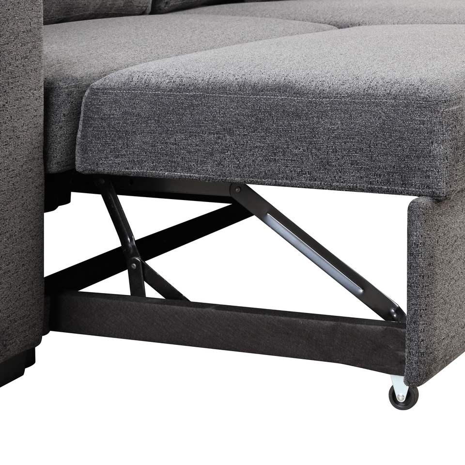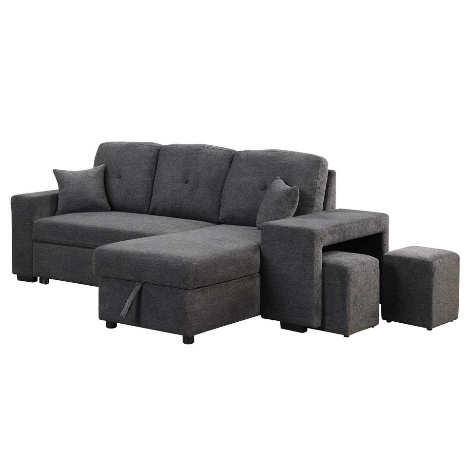 Divano letto angolare a L estraibile reversibile con mensola laterale e 2 sgabelli, divano letto componibile reversibile con contenitore