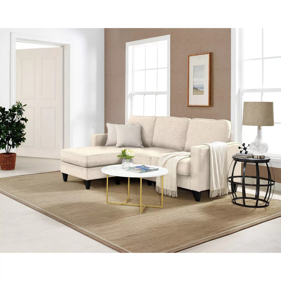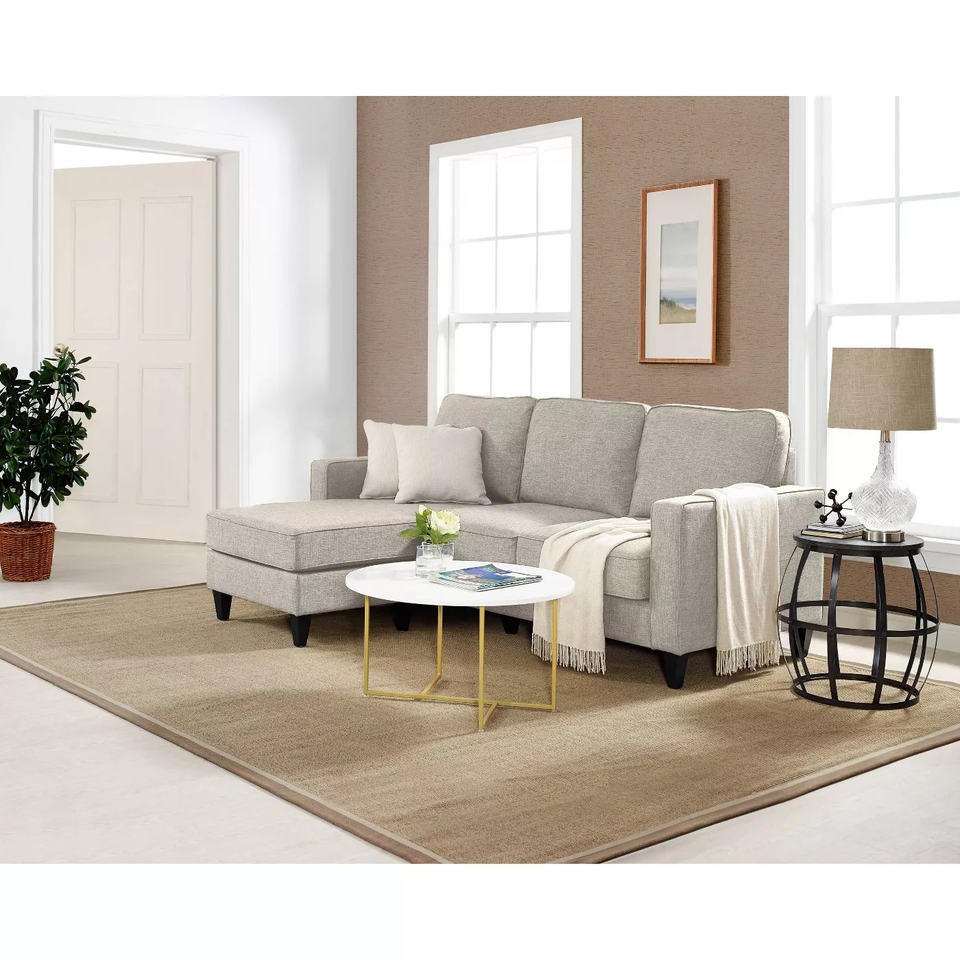 Il piccolo soggiorno reversibile usa il Set di divani componibili imbottiti in tessuto Sofy