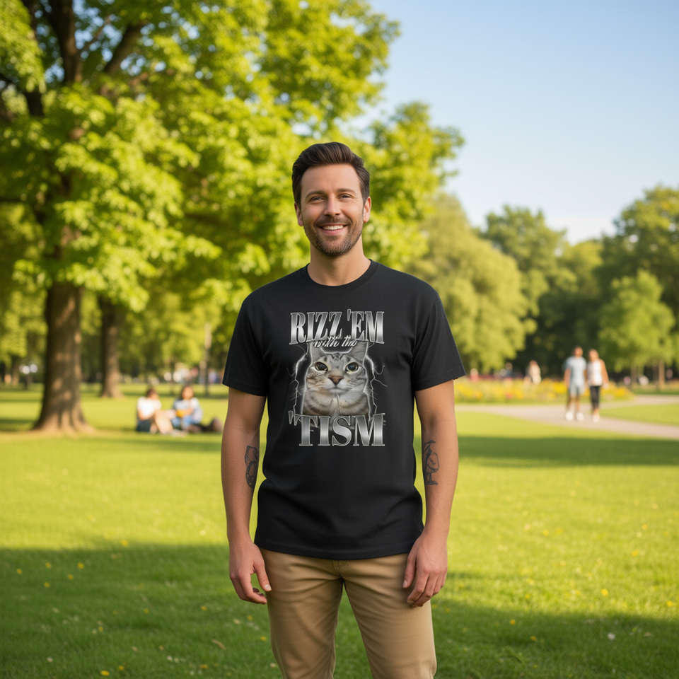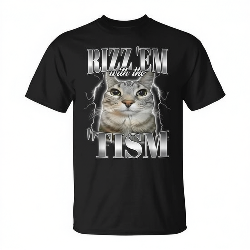 T-shirt girocollo a maniche corte con stampa digitale Rizz Em with the Tism Meme Cat, design divertente per l'autismo, taglia unisex per adulti