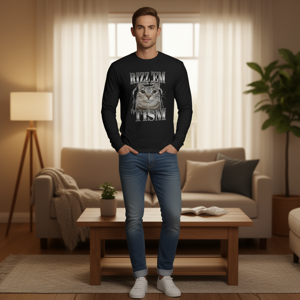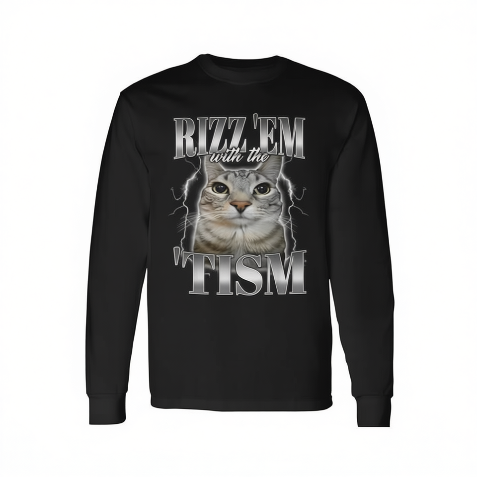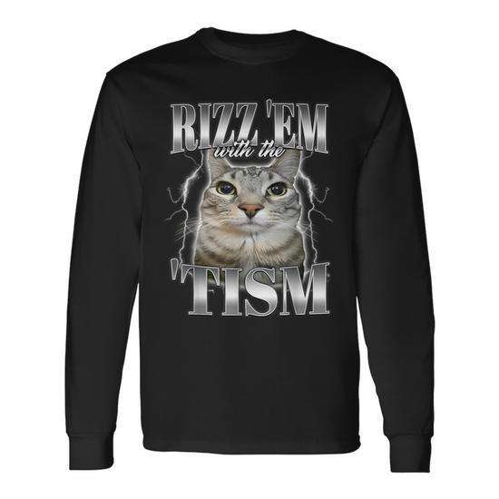 Rizz Em with the Tism Meme Autistic Silly Cat T-shirt unisex a maniche lunghe con scollo rotondo e stampa digitale per adulti