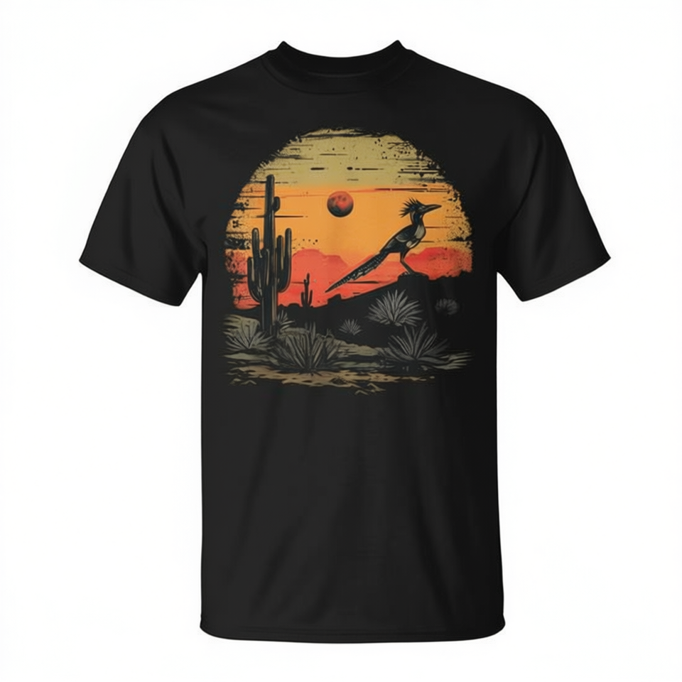 T-Shirt Promozionale con Stampa Serigrafica di Roadrunner, Paesaggio Desertico, Cactus, Arizona, Texas, Nevada, Collo Tondo, Manica Corta