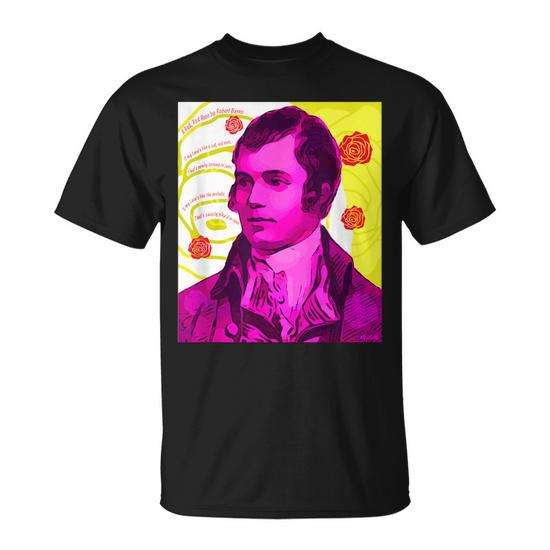 T-shirt con ritratto del poeta Robert Burns, design con rose rosse, unisex, girocollo, manica corta, stampa digitale