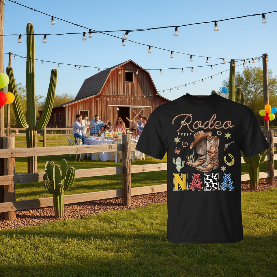 T-shirt promozionale coordinata per la famiglia a tema Rodeo Nana Western Cowboy per il compleanno