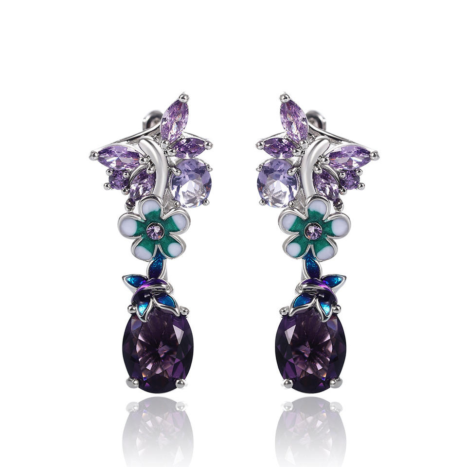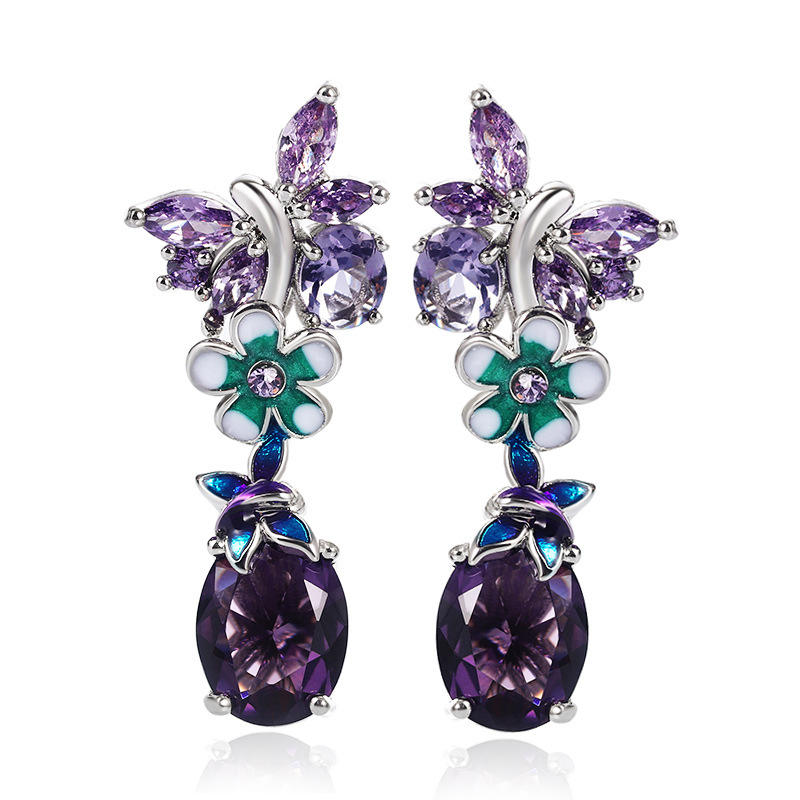 Romantic Flower Drop Earrings Purple Oval Zircon Silver Plated Women's Party Jewelry Alloy Claw Setting