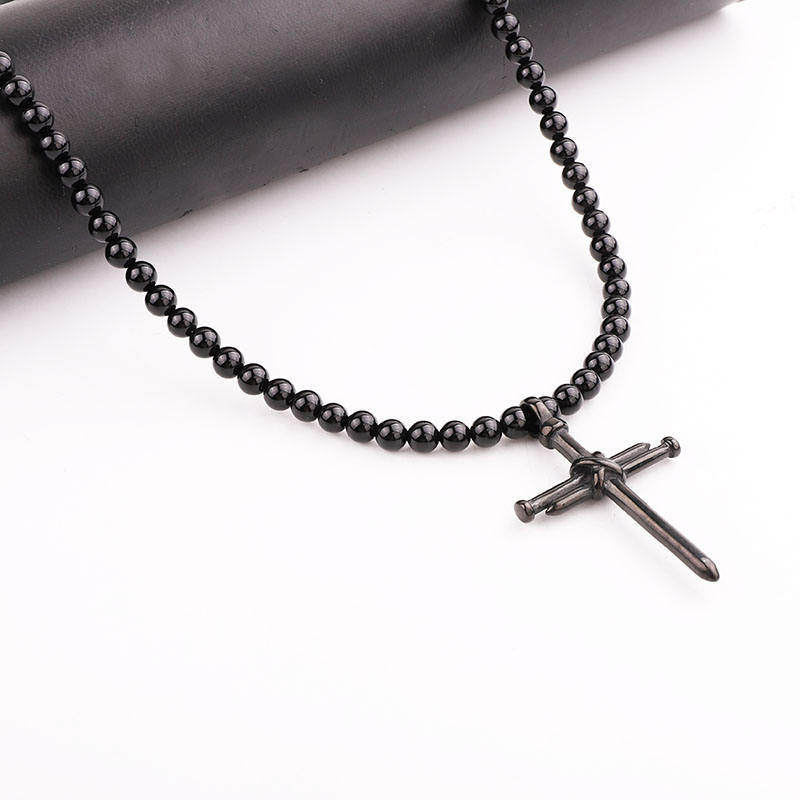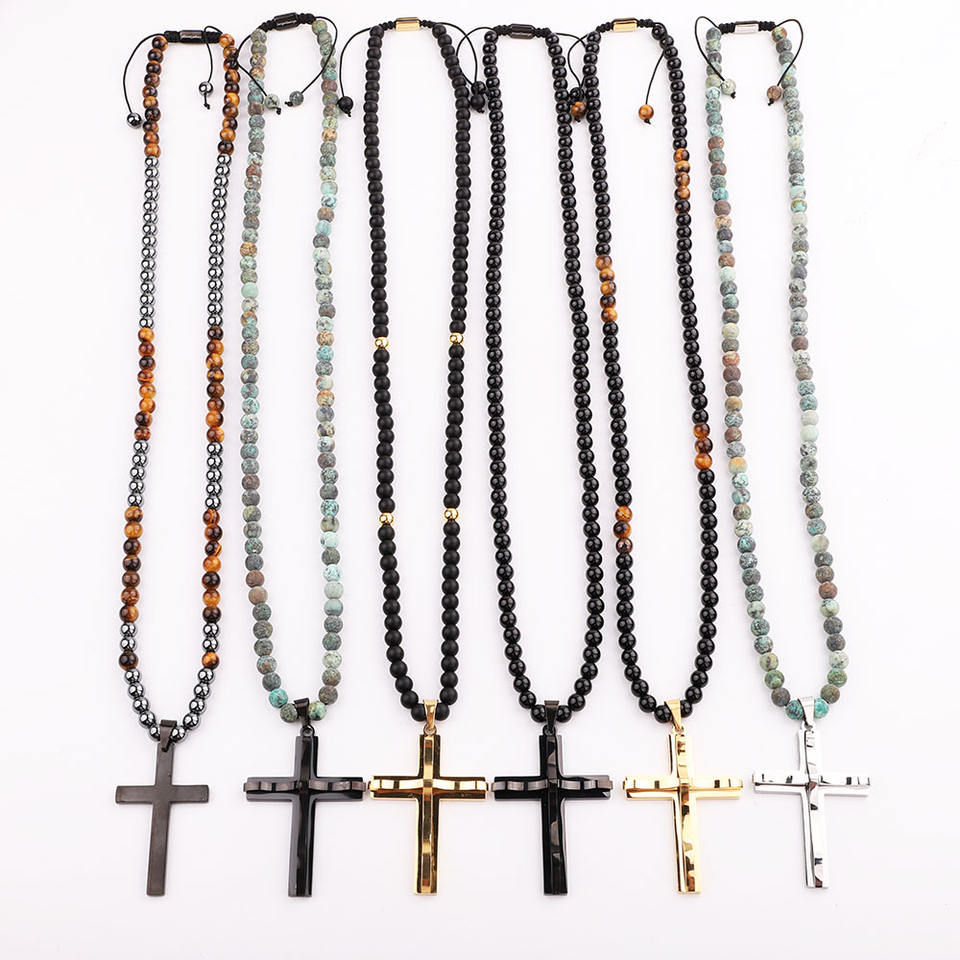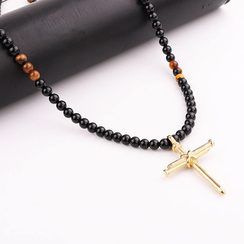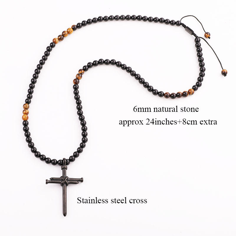 Rosary Necklace Cross Ajustable Beaded Long Jesus Necklace High Quality Matte Onyx Tiger Eye Stone Stainless Steel Men Necklaces