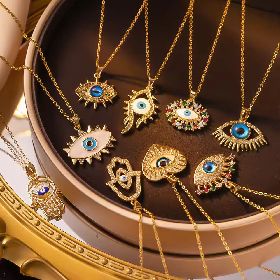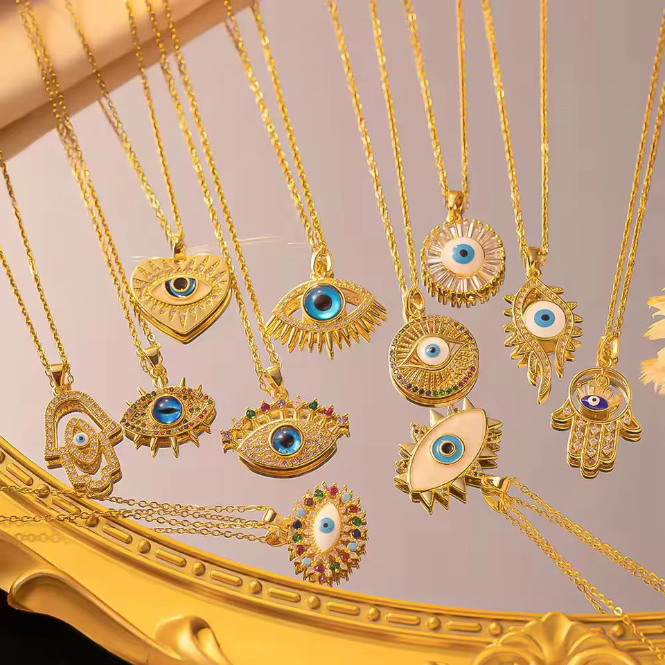 Rose Gold Plated Stainless Steel Turkish Vintage Eye Pendant Necklace Blue Eye Charm Sweater Chain Link for Anniversary