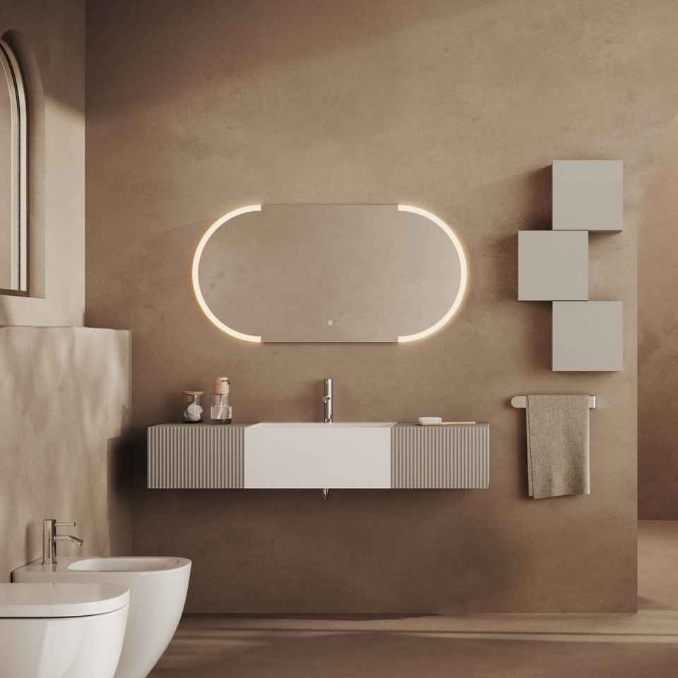 Mobile bagno sospeso Rota 140 cm con LED, 2 cassetti grigio perla e specchio ovale da 120 cm