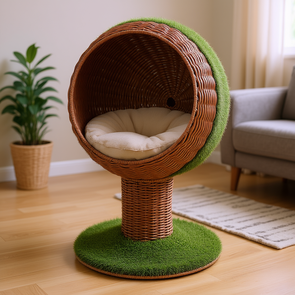 Cuccia per Gatti Girevole a Forma di Uovo, Marrone, in Erba Intrecciata, Rialzata con Cuscino, per Interni