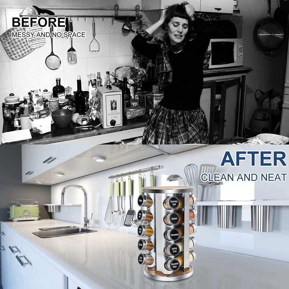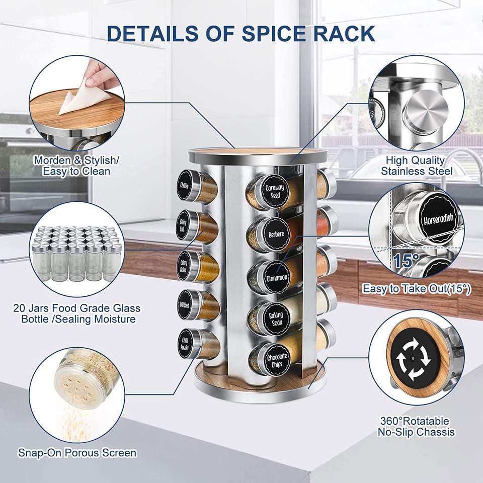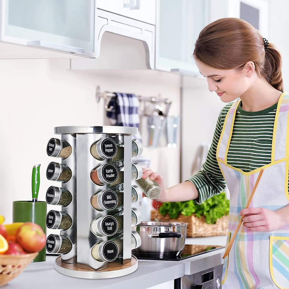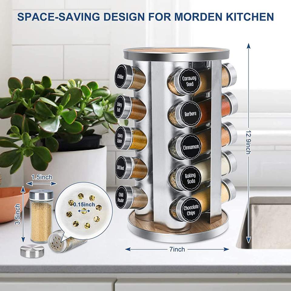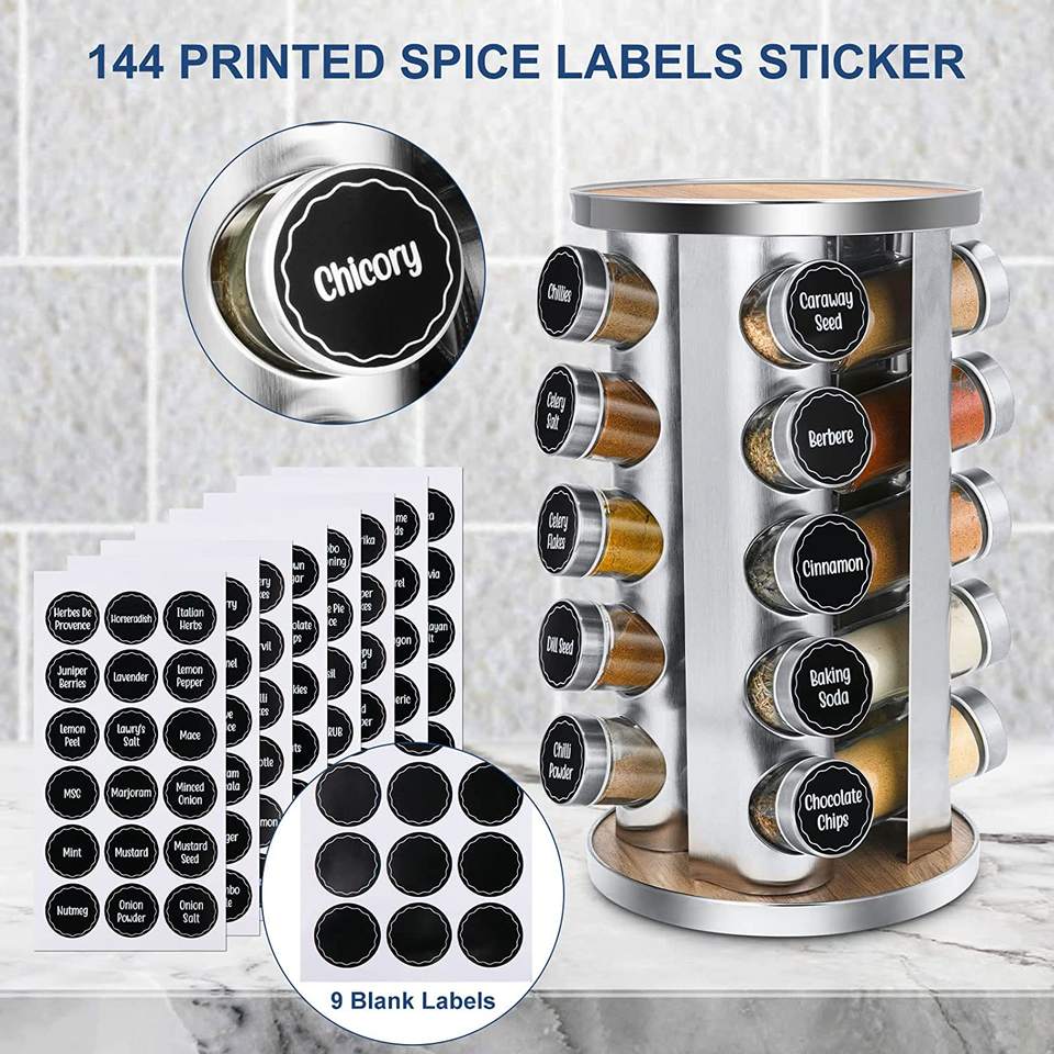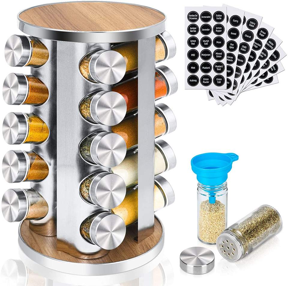 Organizzatore portaspezie rotante per armadietto con etichette per spezie prestampate e imbuto con 20 barattoli di spezie in vetro
