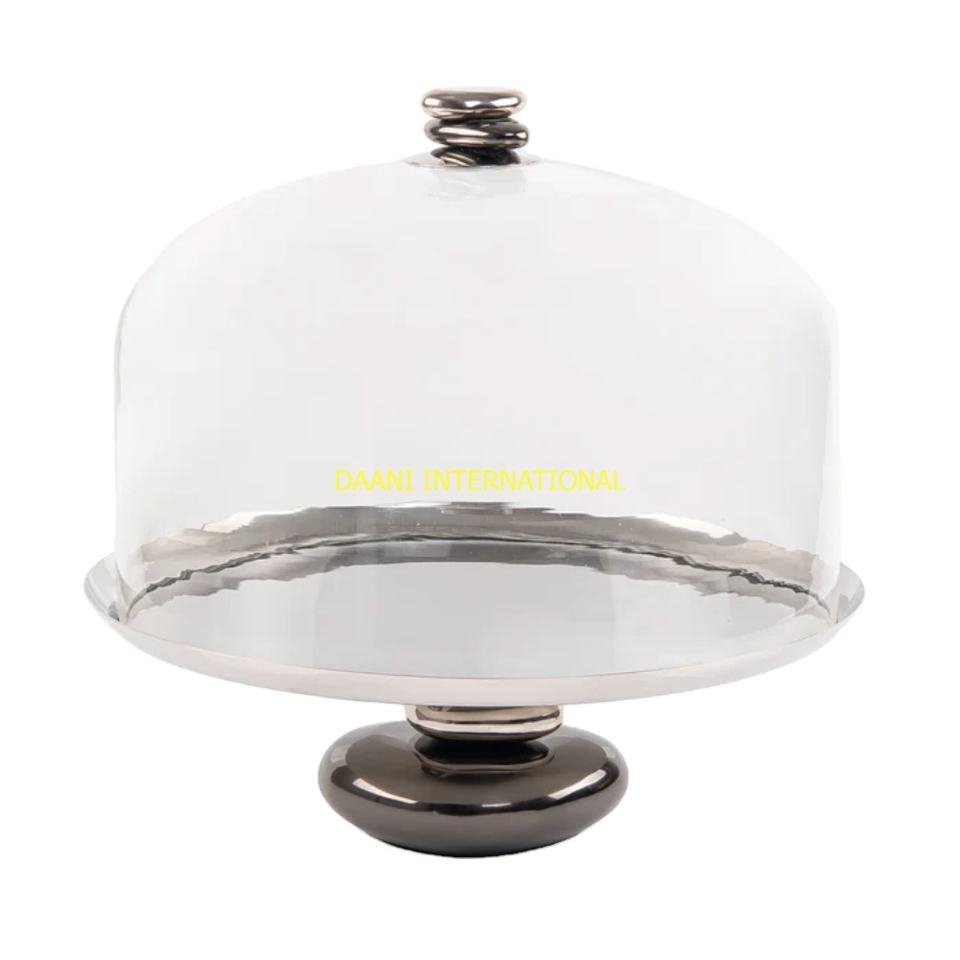 Torta rotonda in acciaio inox con copertura a cupola in vetro affumicato moderna Base piedistallo torte dolci e Dessert espositore
