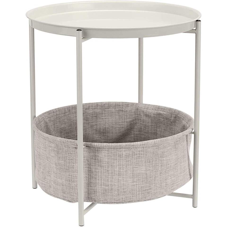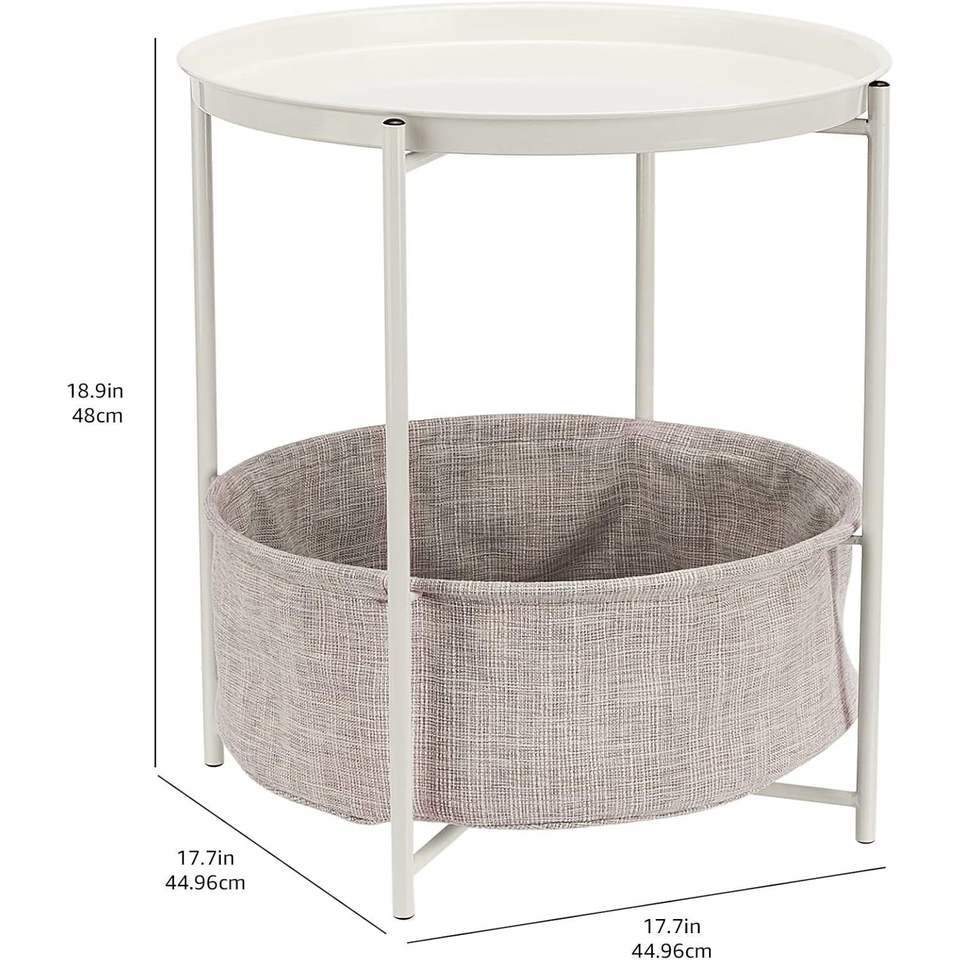 Tavolino rotondo bianco/grigio melange con cestino in tessuto, comodino da 17,7 pollici, altezza 18,9 pollici