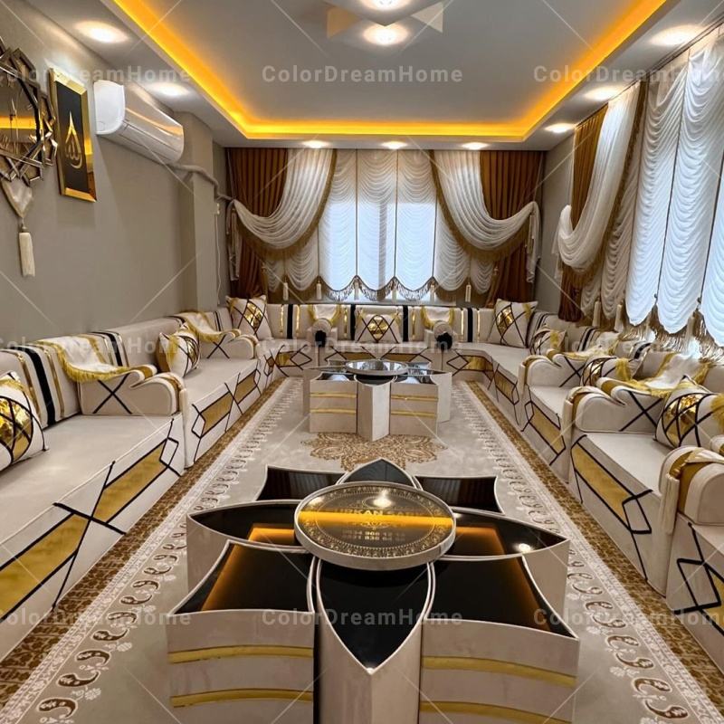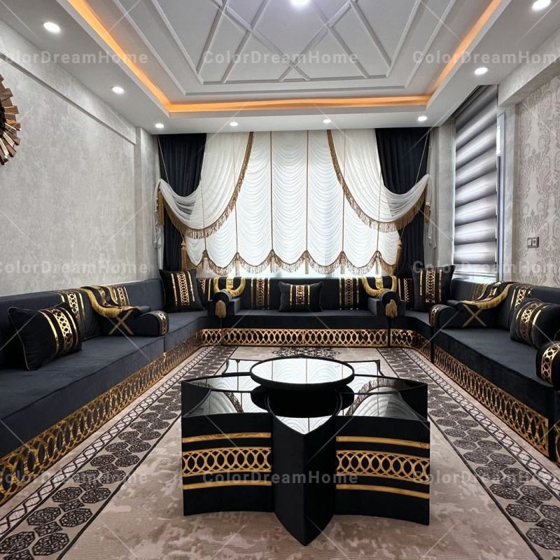 Set Divani Arabi Majlis da Terra Personalizzati Neri e Oro, Design di Lusso Reale