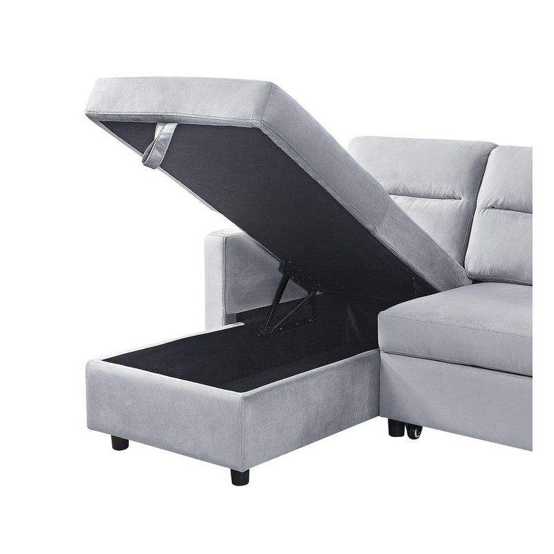Divano Sezionale Reversibile Ruby in Velluto Grigio Chiaro da 207 cm con Chaise Longue Contenitore e Tasca Laterale