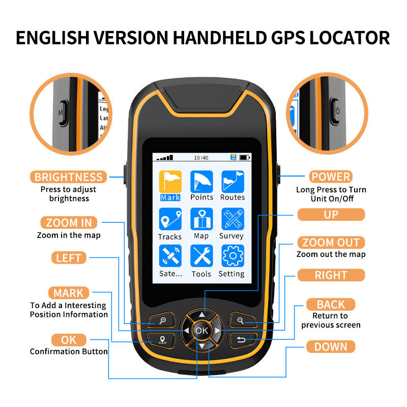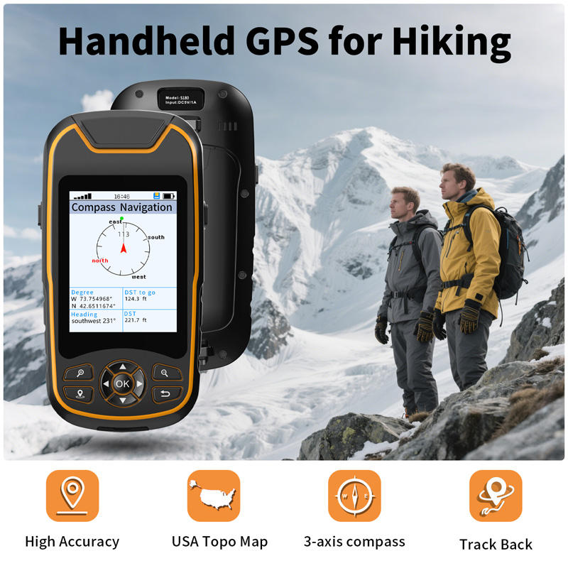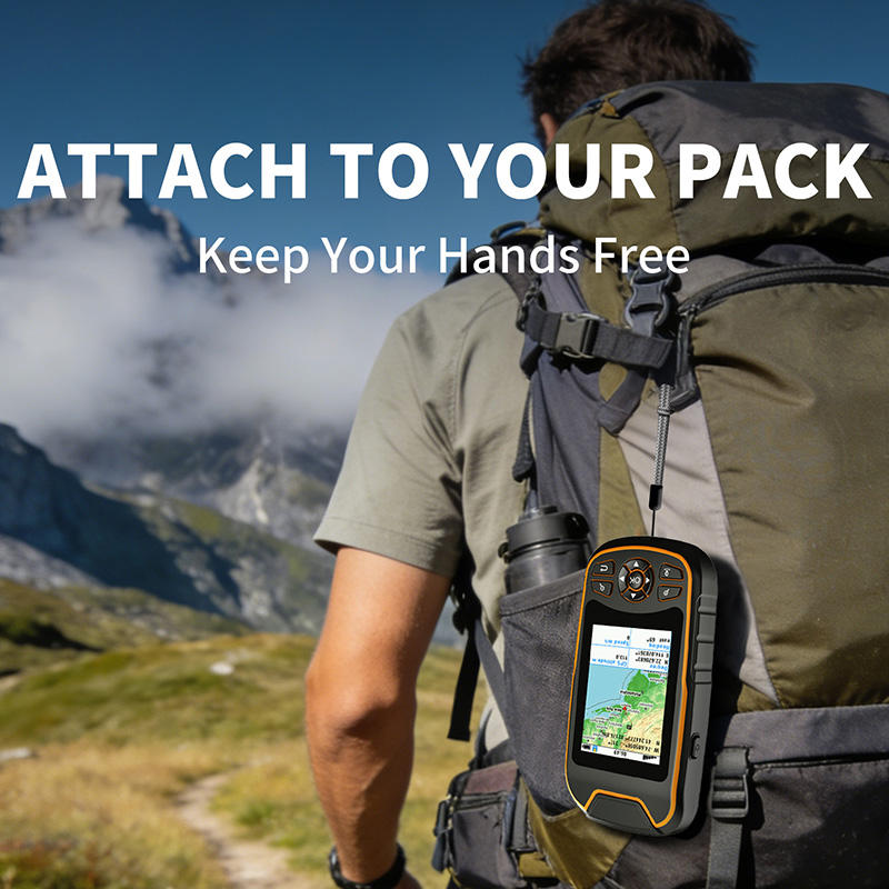 Navigatore GPS palmare robusto e resistente all'acqua con touchscreen a colori, mappe pre-caricate con percorsi e strade navigabili.